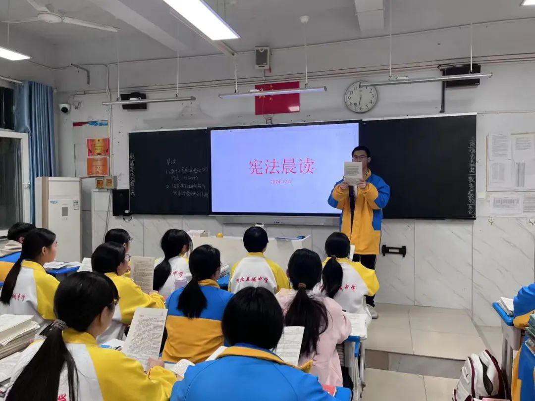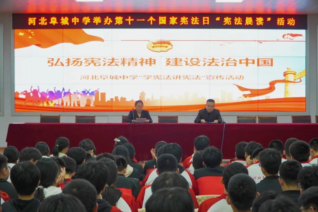 12月4日是第十一个国家宪法日。为增强全校师生宪法意识,弘扬宪法精神,维护宪法权威,全面推进依法治校,河北阜城中学校当天组织开展了“宪法晨读”活动。