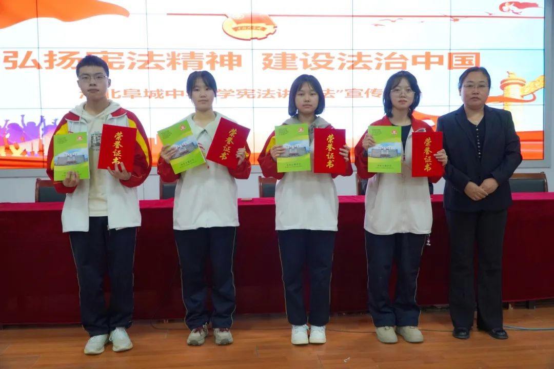 学校负责人为学校近日组织的“学宪法 讲宪法”知识竞赛和演讲竞赛活动中获奖的同学颁发荣誉证书。