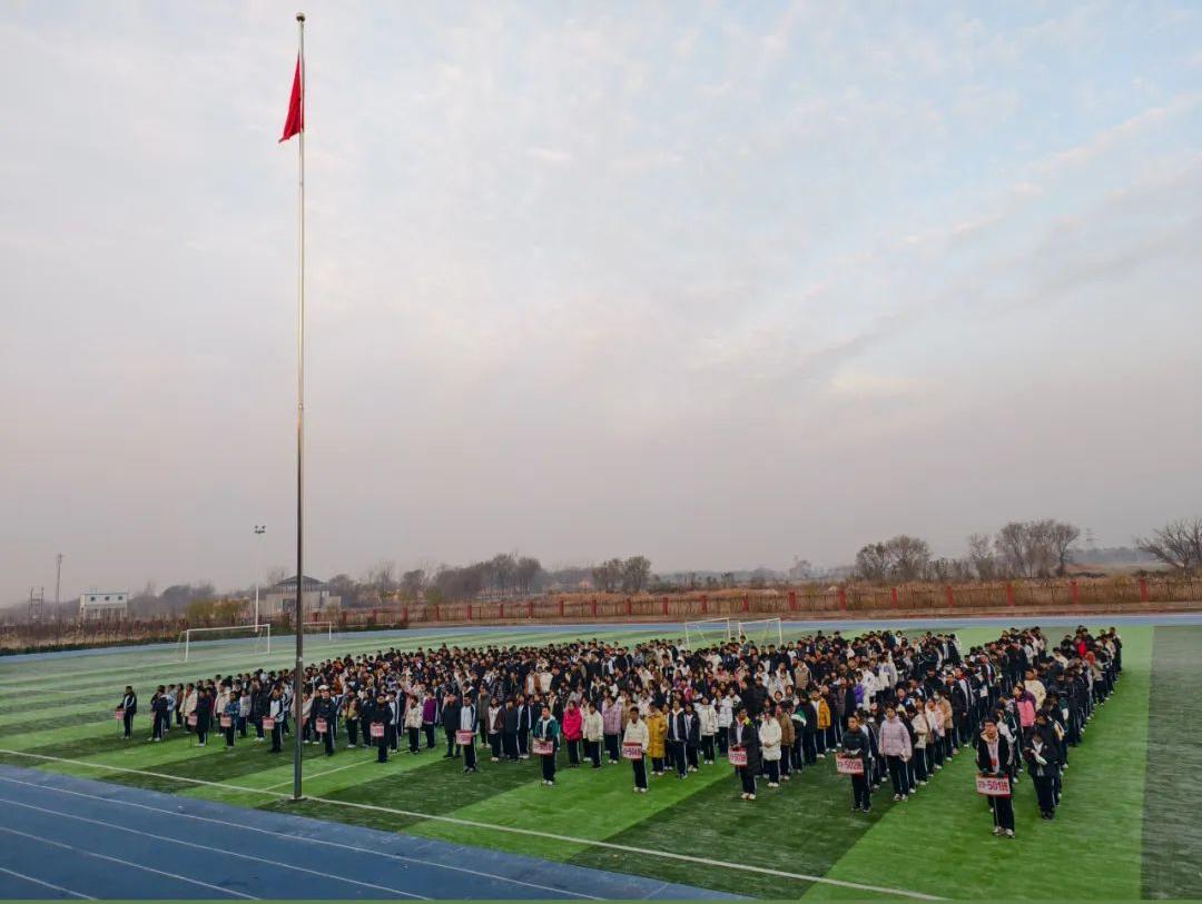 全体师生精神饱满齐聚操场,国旗队迈着整齐有力的步伐,精神抖擞地走向升旗台开启升旗仪式。在激昂的国歌声中,鲜艳的五星红旗缓缓升起,全体师生集体肃立,高唱国歌,行注目礼,满怀着对祖国和宪法的热爱与敬意。
