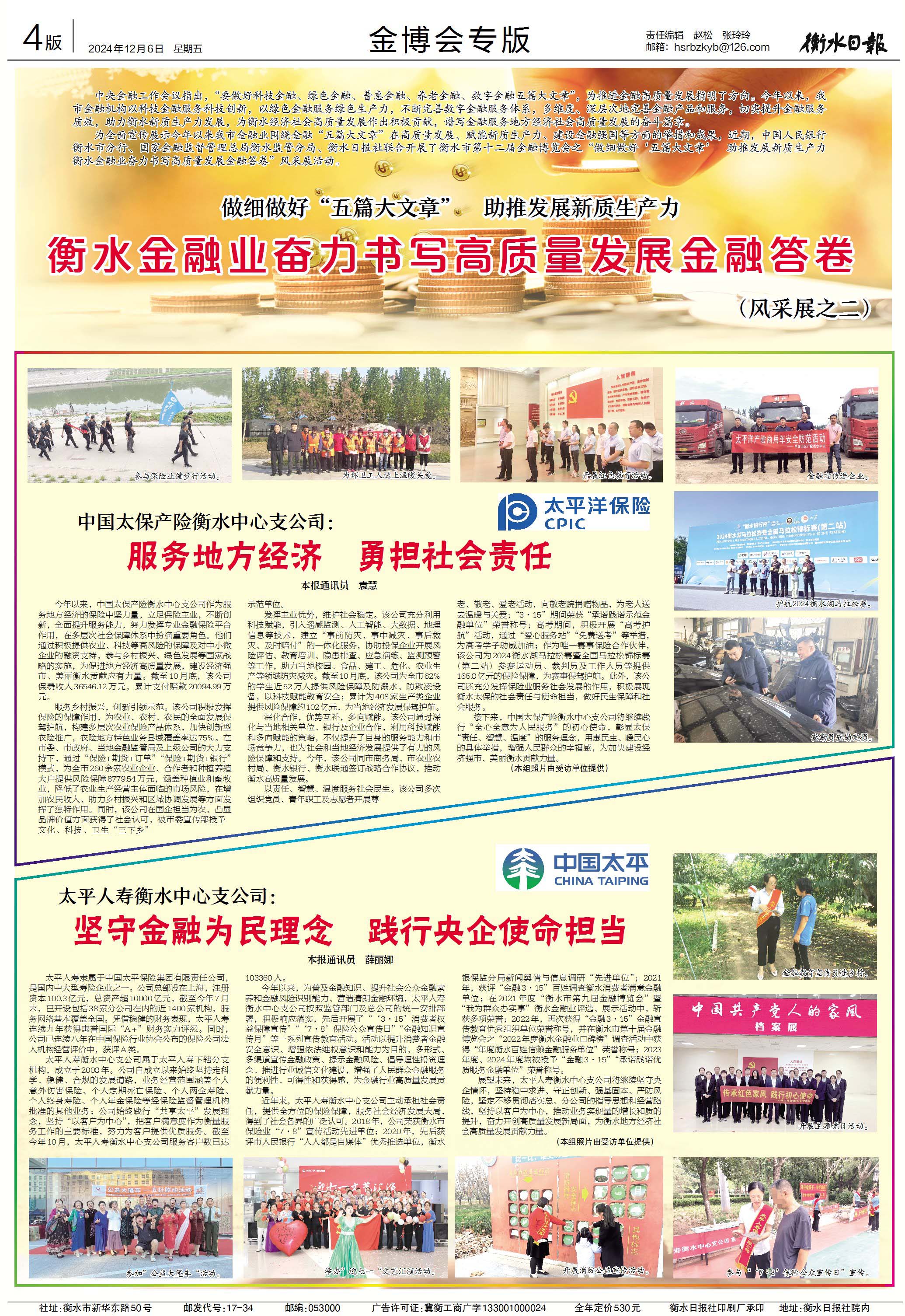 展望未来,太平人寿衡水中心支公司将继续坚守央企情怀,坚持稳中求进、守正创新、强基固本、严防风险,坚定不移贯彻落实总、分公司的指导思想和经营路线,坚持以客户为中心,推动业务实现量的增长和质的提升,奋力开创高质量发展新局面,为衡水地方经济社会高质量发展贡献力量。