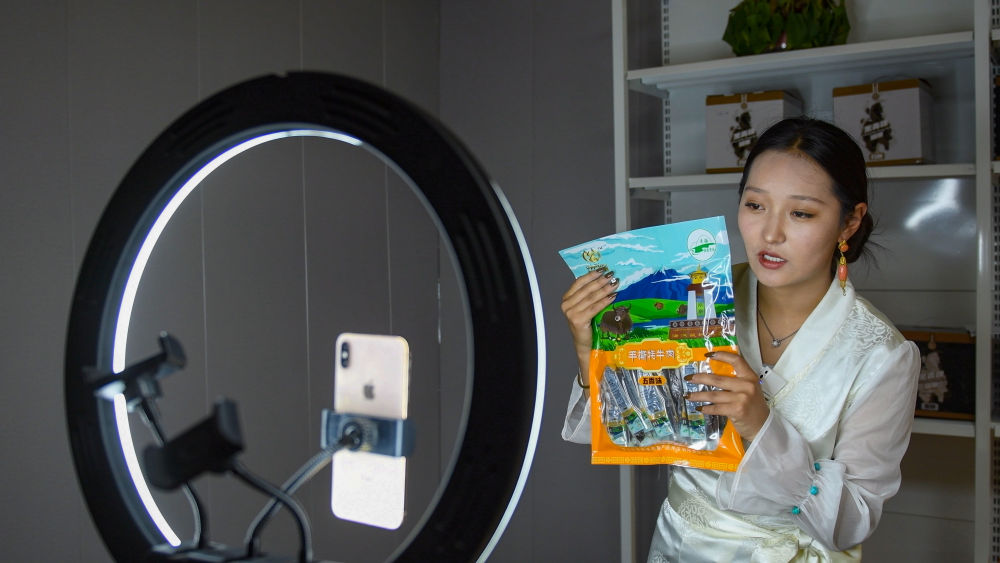 9月24日,果洛藏贡麻村村民多杰吉在进行网络带货直播。(潘彬彬 摄)