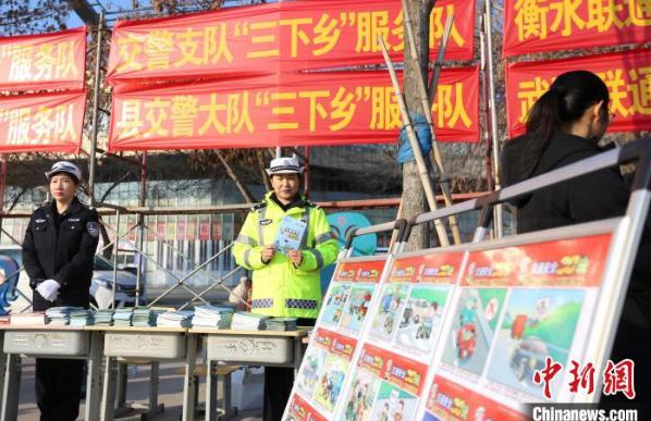 12月6日,河北省衡水市文化科技卫生“三下乡”集中示范活动在衡水市武强县周窝镇举办。衡水市县两级“三下乡”83家成员单位为2.1万人次提供了健康义诊、科技技术讲解等服务,赠送图书、对联、药品、种子、农药等生产生活用品24万余份。同时,49支服务小分队深入到武强县各帮扶村,把个性化、菜单式的服务送到百姓家门口。图为活动现场,衡水市公安交通警察支队“三下乡”服务队布置好展台,准备为群众发放交通安全宣传册。 薛涛 摄