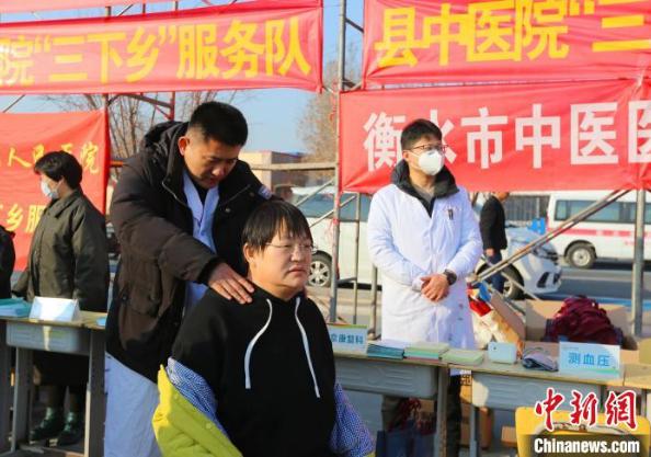 图为活动现场,衡水市中医医院医护人员为群众按摩肩颈,舒缓疼痛。 薛涛 摄
