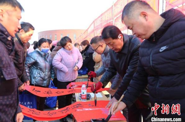 图为活动现场,书法爱好者为群众写对联。 薛涛 摄