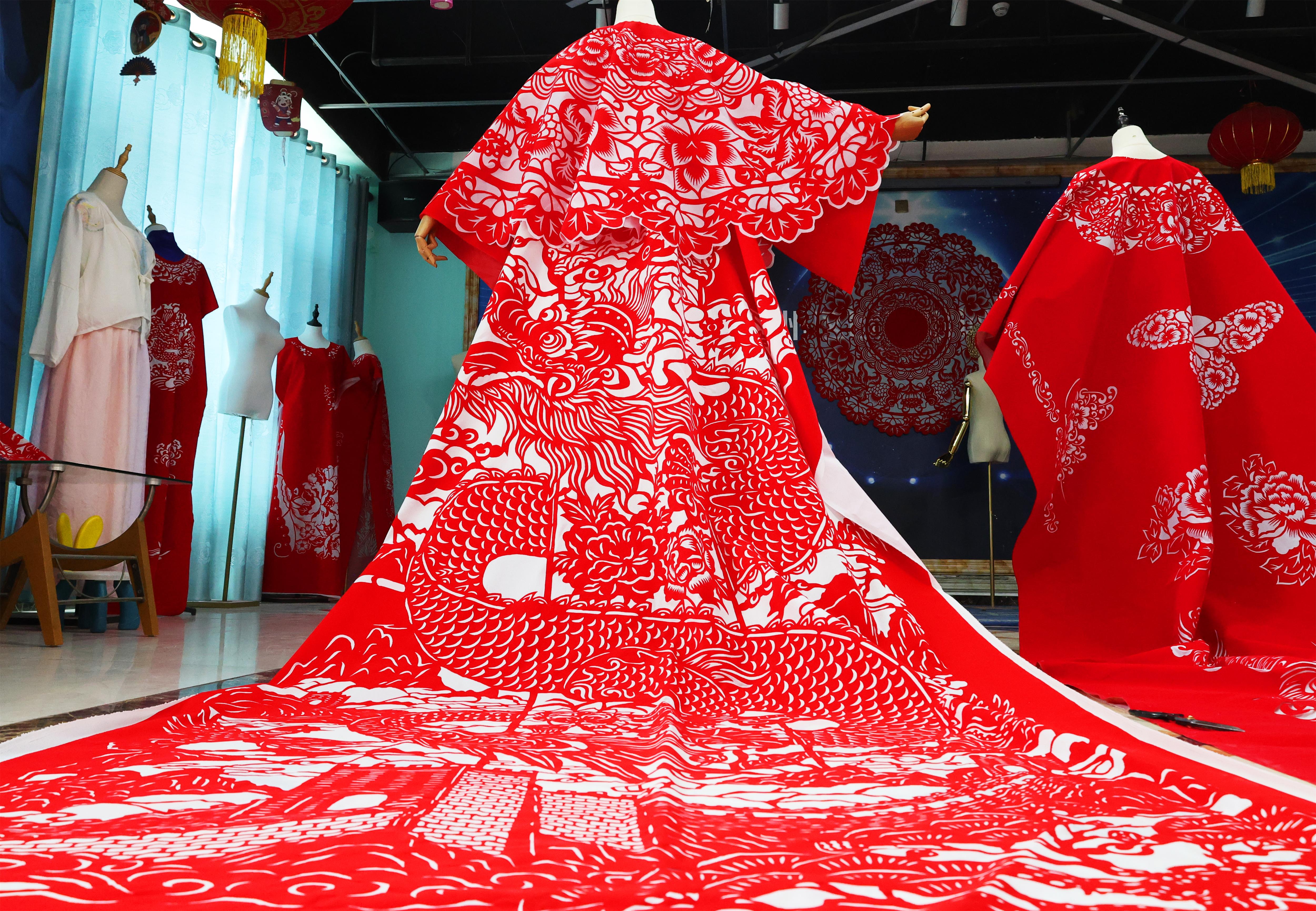 12月10日,记者走进李娜的工作室,只见屋内各类剪纸服装琳琅满目,红、蓝、绿、紫等色彩相互交织。李娜正忙碌地为新客户赶制同款红色剪纸服装,她满脸喜悦地说:“自从视频爆火后,巴黎、日本等好多国外博主都来找我定制,这几天忙得不可开交,吃住都在工作室了。”