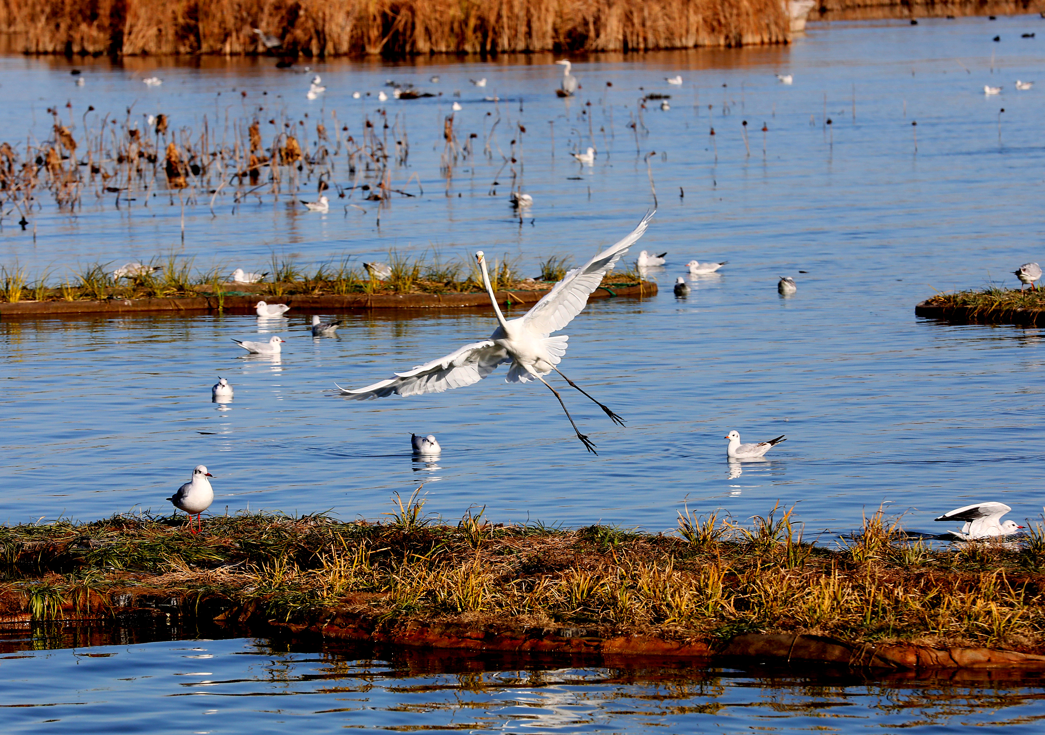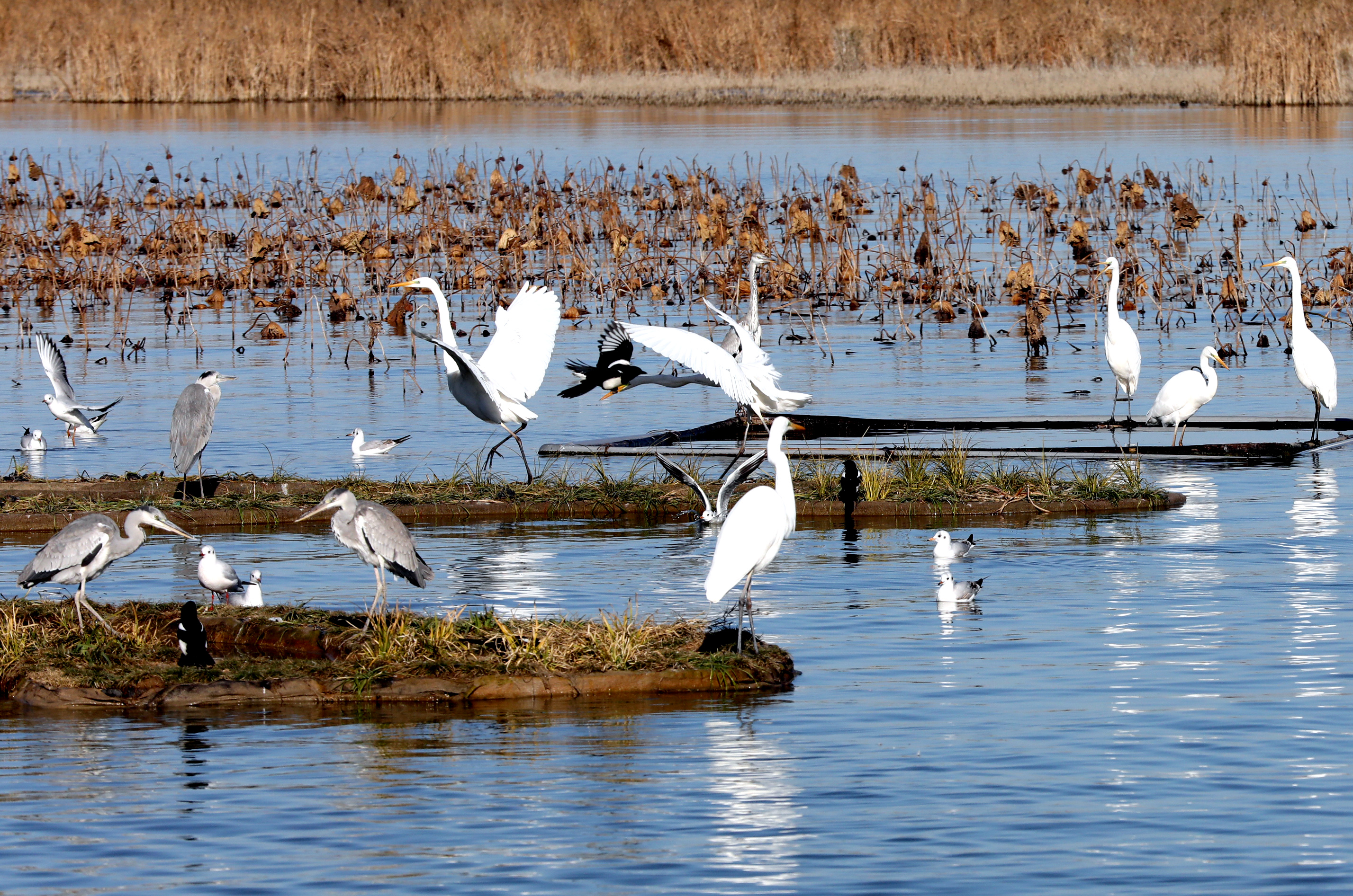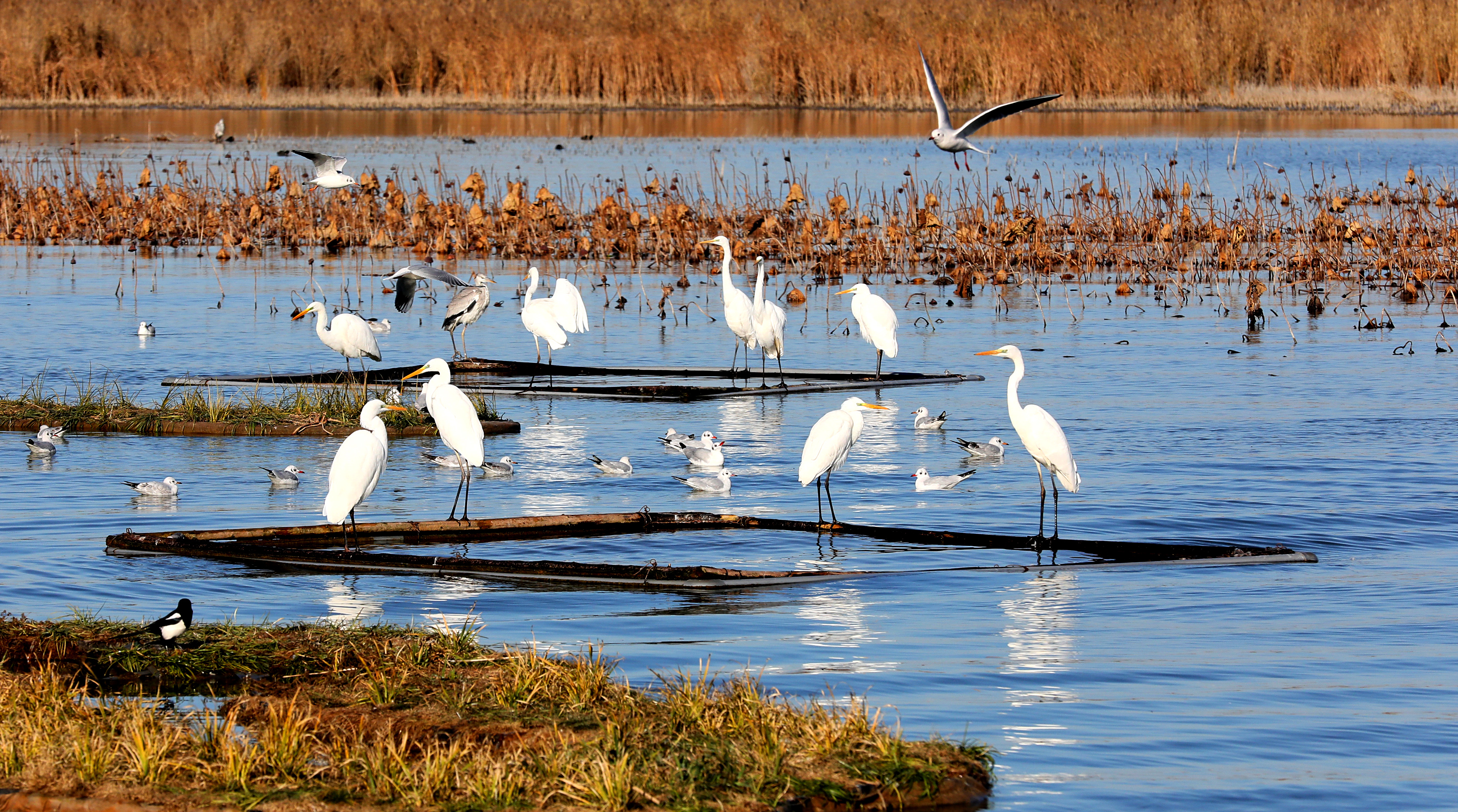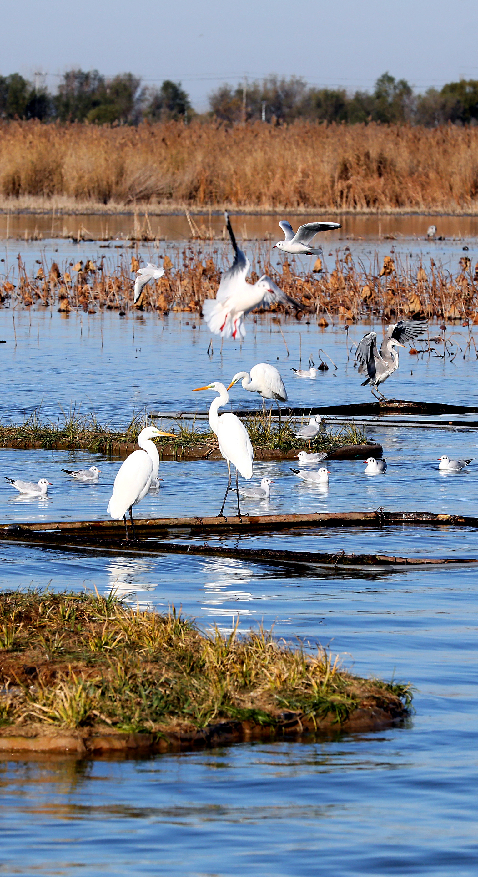 近年来,随着衡水湖湿地生态环境的持续改善,吸引大批水鸟来此栖息繁衍。每年秋冬季,候鸟迁徙期间,飞抵衡水湖的鸟类种类多样,包括豆雁、红嘴鸥、鸬鹚、白琵鹭等,最多时逾10万只鸟类在此停留或栖息越冬,呈现一幅人与自然和谐相生的美丽画卷。