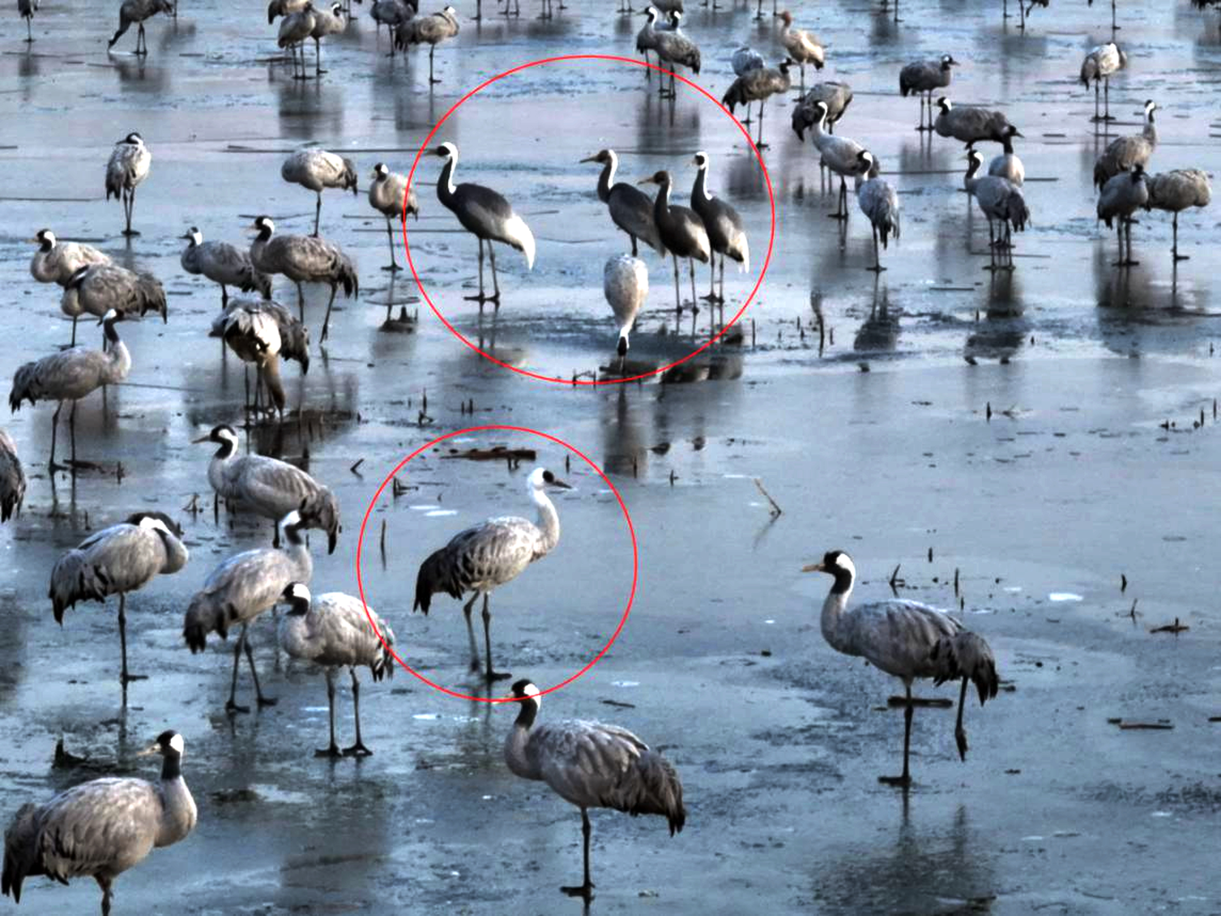 据河北衡水湖国家级自然保护区消息,工作人员近日在进行冬季鸟类监测时,接到影友提供的影像资料——三种鹤在湖区冰面上罕见同框,分别是4只国家一级保护动物白枕鹤和1只同级别的白头鹤,在国家二级保护动物灰鹤群中时而低头觅食,时而振翅欲飞。白枕鹤、白头鹤分别与灰鹤等其它鹤类混居的情况此前曾有发现,但这次是在衡水湖首次记录这三种鹤类同框。衡水湖位于河北省衡水市,是“东亚—澳大利西亚候鸟迁徙线”上的重要驿站,享有“京津冀最美湿地”等美誉。图为12月16日,在河北衡水湖拍摄到白枕鹤(上部红圈中)和白头鹤(下部红圈中)与灰鹤群一同活动的场景。