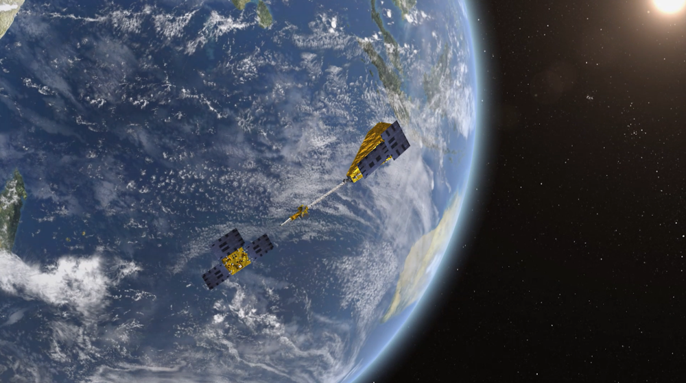“澳科一号”卫星在轨示意图(右为A星,左为B星)。图片由澳门科技大学“澳科一号”团队提供