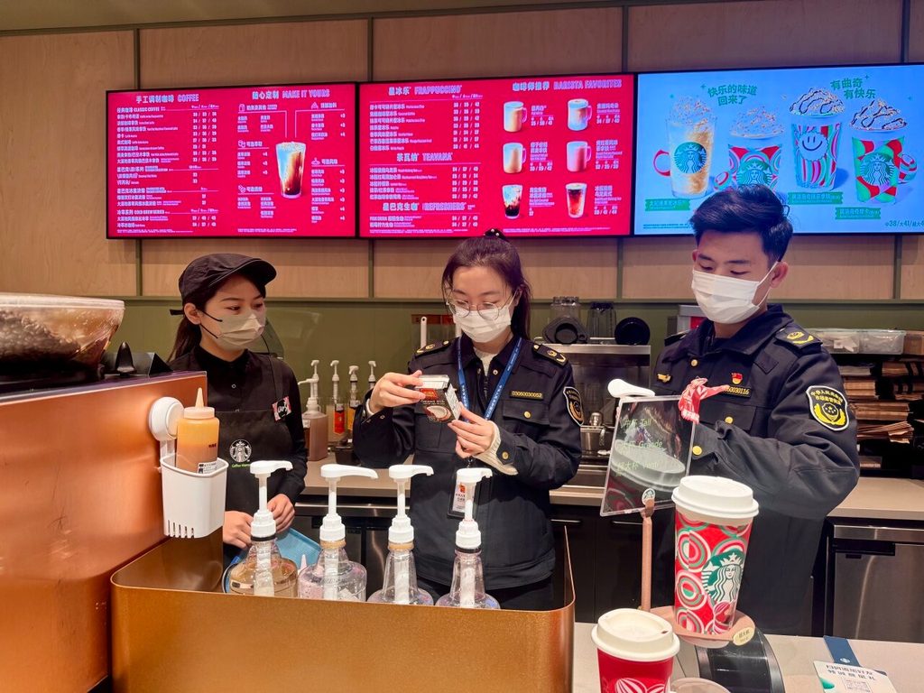 12月19日,保定市市场监督管理局高新区分局工作人员到一家通过“一证通用”政策开设的星巴克咖啡店进行现场核查。陈曼 摄