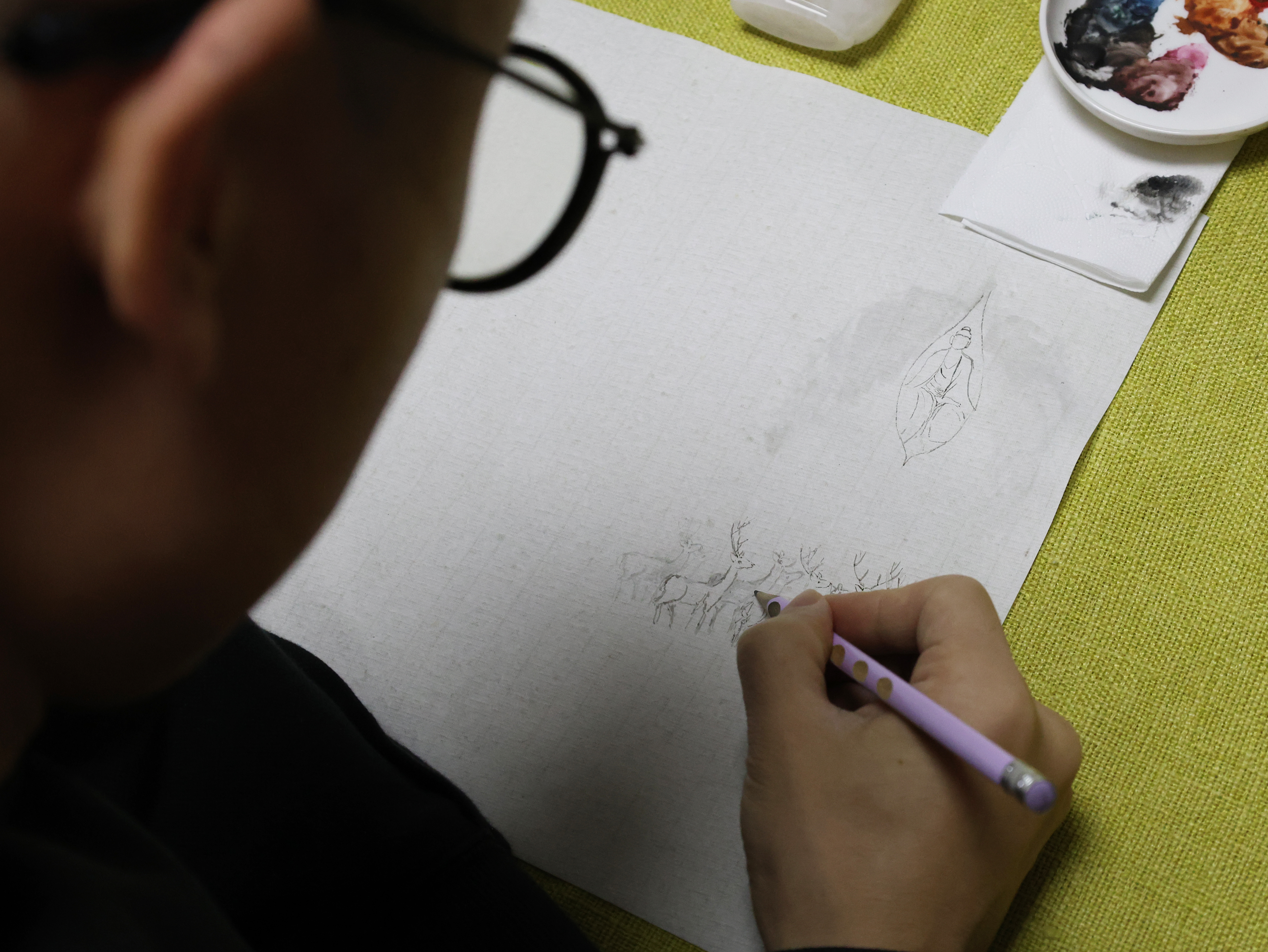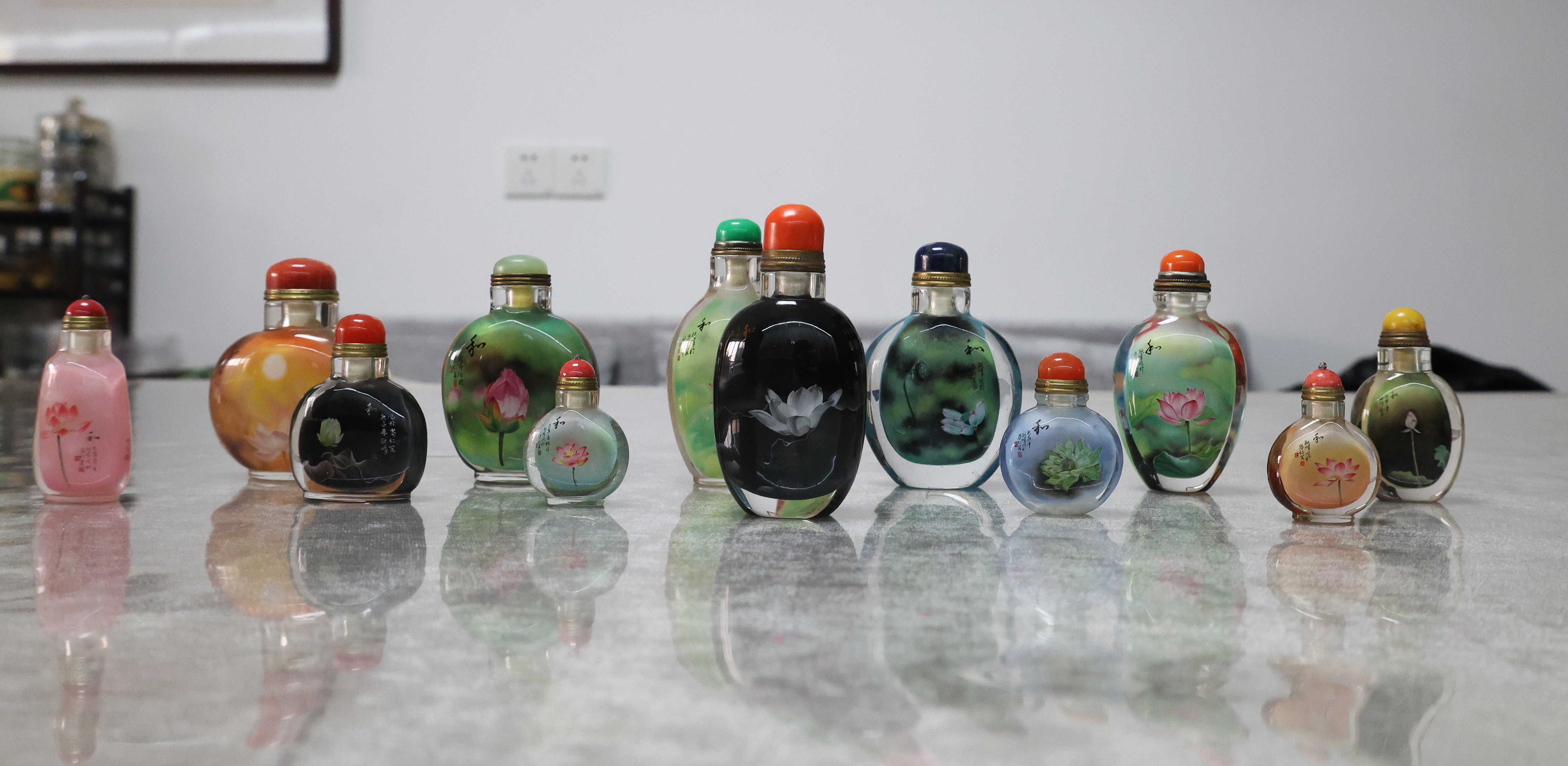 走进粘跃峰内画艺术工作室,粘跃峰正手拿一支细长的自制笔,探入一个寸余大的鼻烟壶内作画。只见他落笔刚劲有力,勾画层次分明,点染错落有致,在轻描淡写之间,山水、花鸟、人物等图案跃然而出。