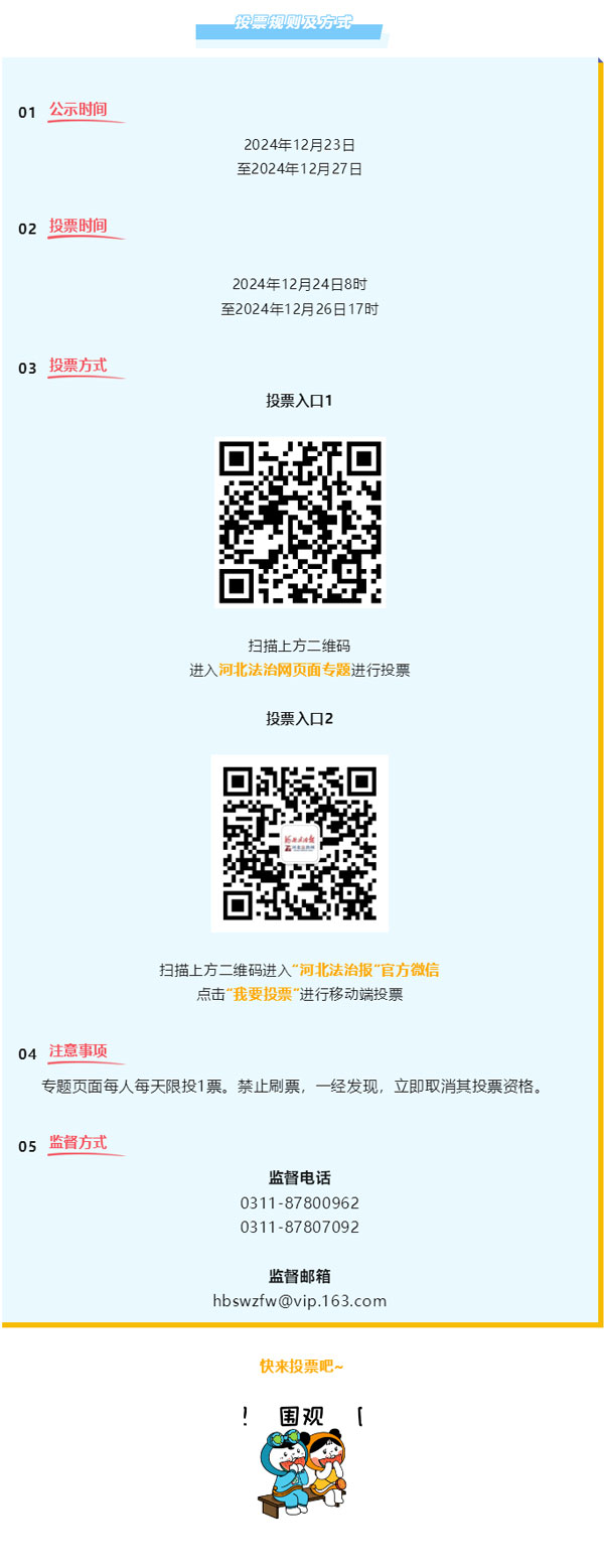 按照活动流程,目前已进入公示评选阶段。公示评选分为社会公众投票和专家评审两个环节。从12月24日起至12月26日止,社会公众可登录河北法治网(www.hbfzb.com)专题页面进行投票,或扫描二维码进入“河北法治报”官方微信,点击“我要投票”进行移动端投票。专题页面每人每天限投一票,禁止刷票。一经发现刷票行为,立即取消投票资格。社会公众如有意见可反馈至邮箱:hbswzfw@vip.163.com。公示投票结束后,评委会将按照事迹突出、优中选优的标准,正式评选出2024年度全省“最美政法干警”。