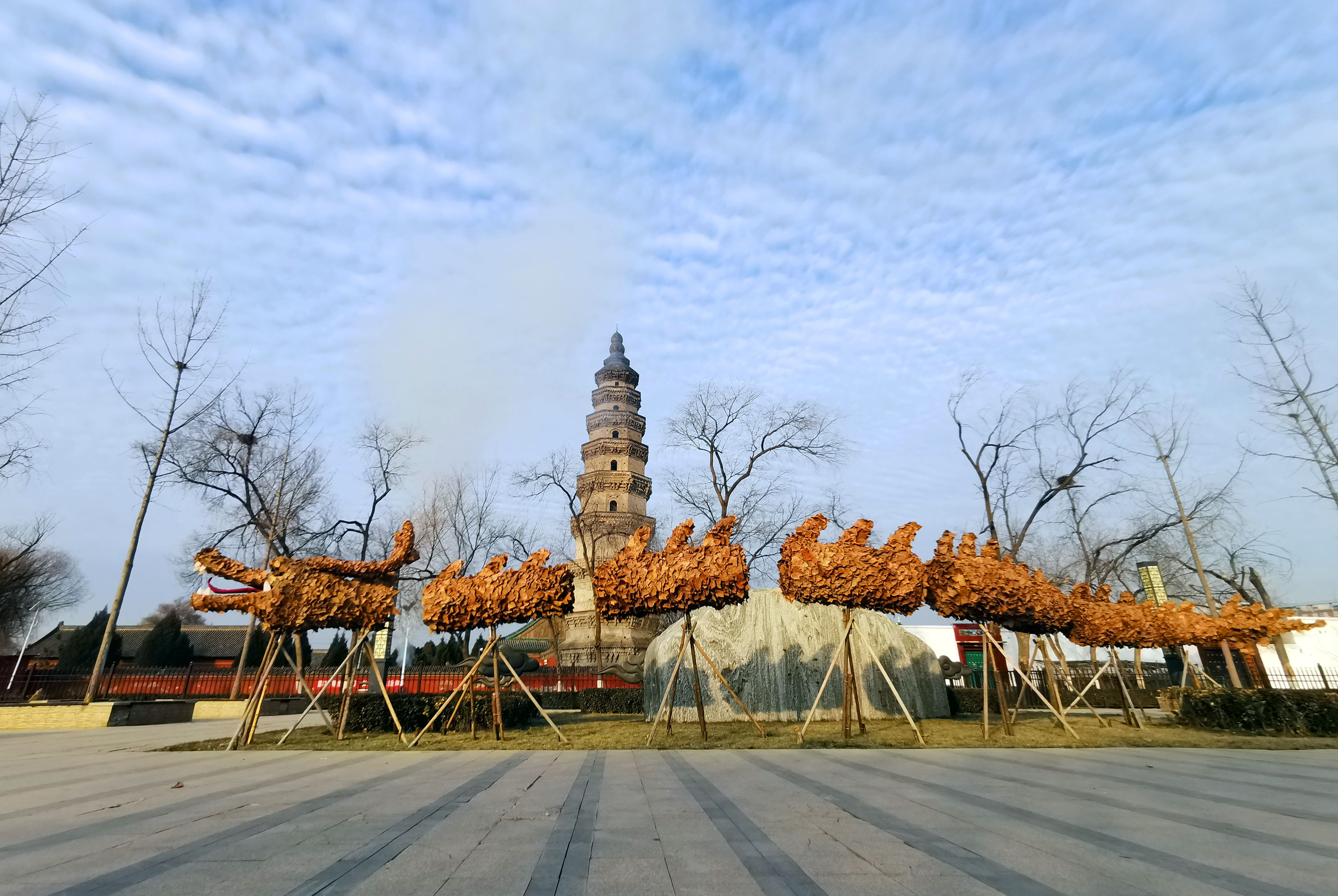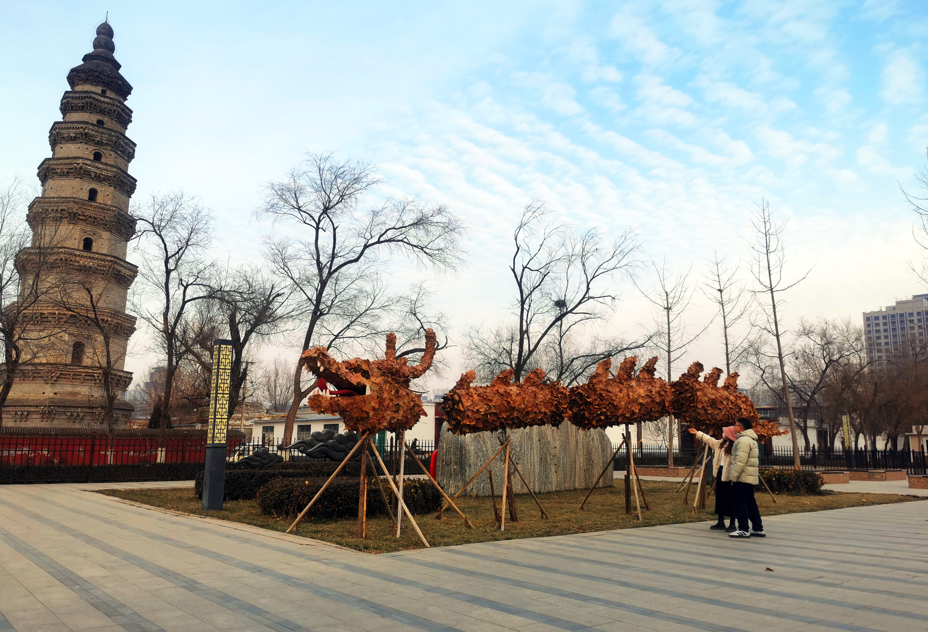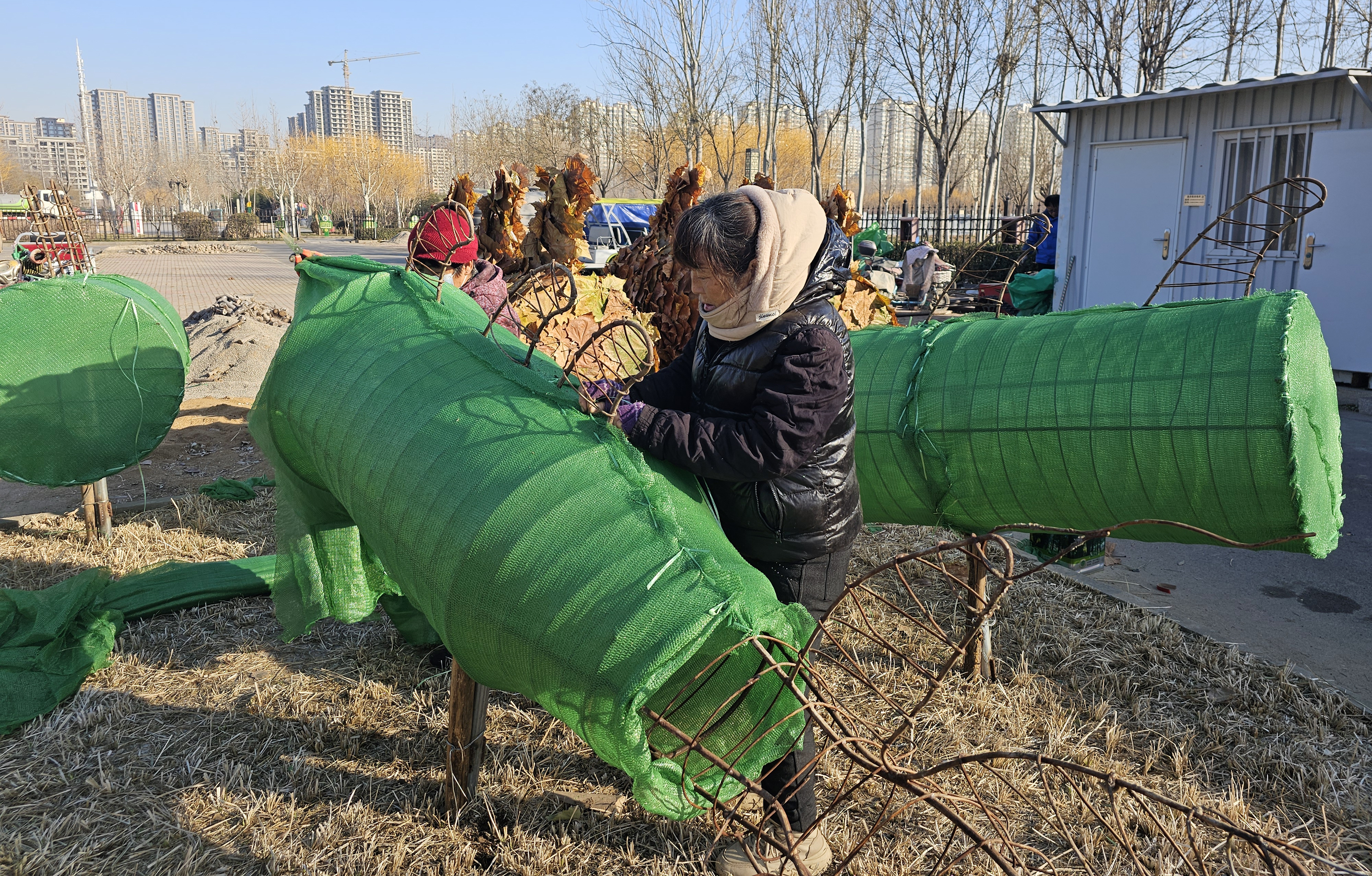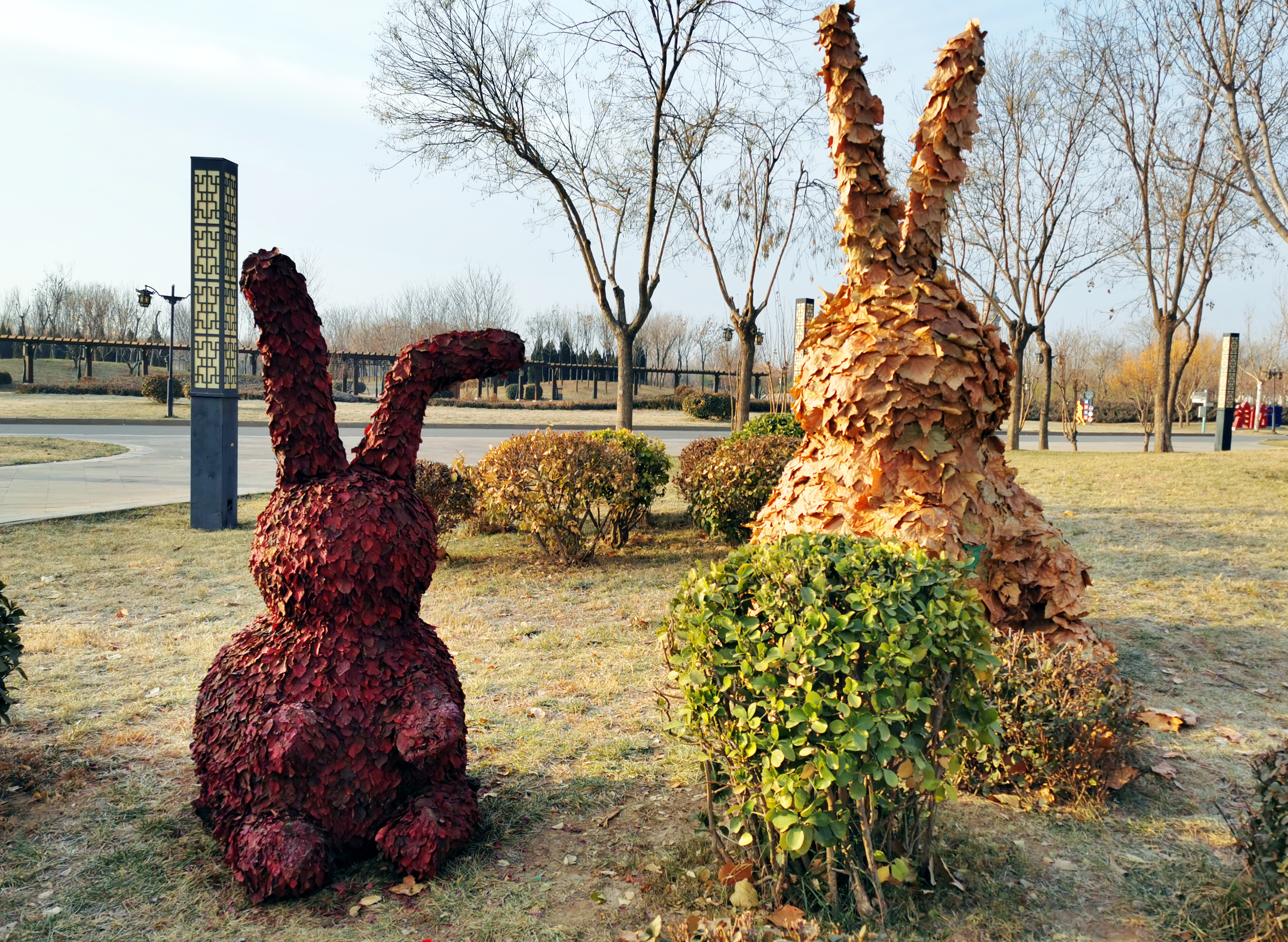 12月24日,来到宝云公园西门处,一条气势磅礴的“巨龙”映入眼帘,龙头挺立,金黄色的龙身,神态威武的造型很是惊艳。“以废弃的钢筋和树叶为主要材料,龙身是用钢筋、钢丝制作而成,龙鳞用法桐的落叶粘连,用时五天时间制作完成。”宝云公园负责人介绍,除了这条近二十米的龙造型,还在公园的北门处精心制作了两个兔子造型,巧妙的构思不仅给人耳目一新的感觉,也为寒冷的冬季增添了勃勃生机。