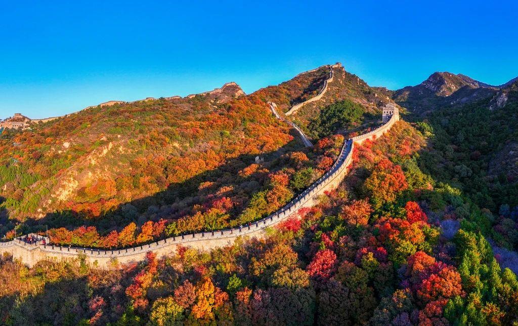 △深秋的北京八达岭长城层林尽染,风景如画。