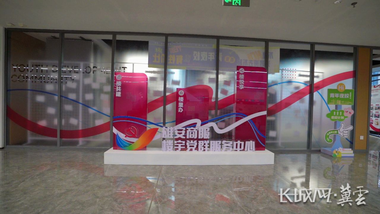 “楼共建”“楼里办”“楼悦享”,在“楼宇党建+青年发展型社区”雄安模式的引领之下,楼宇经济的活力更旺,青年发展的后劲更足,正如商服楼宇党群服务中心的“红飘带”一样,连接起每一家企业、每一位青年……