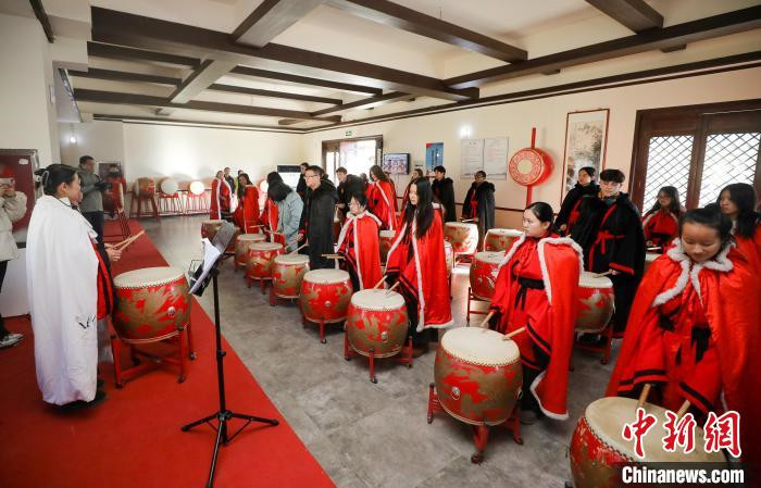 图为12月28日,美国青少年交流团在衡水湖旅游景区孙敬学堂学习鼓乐。 陈康 摄