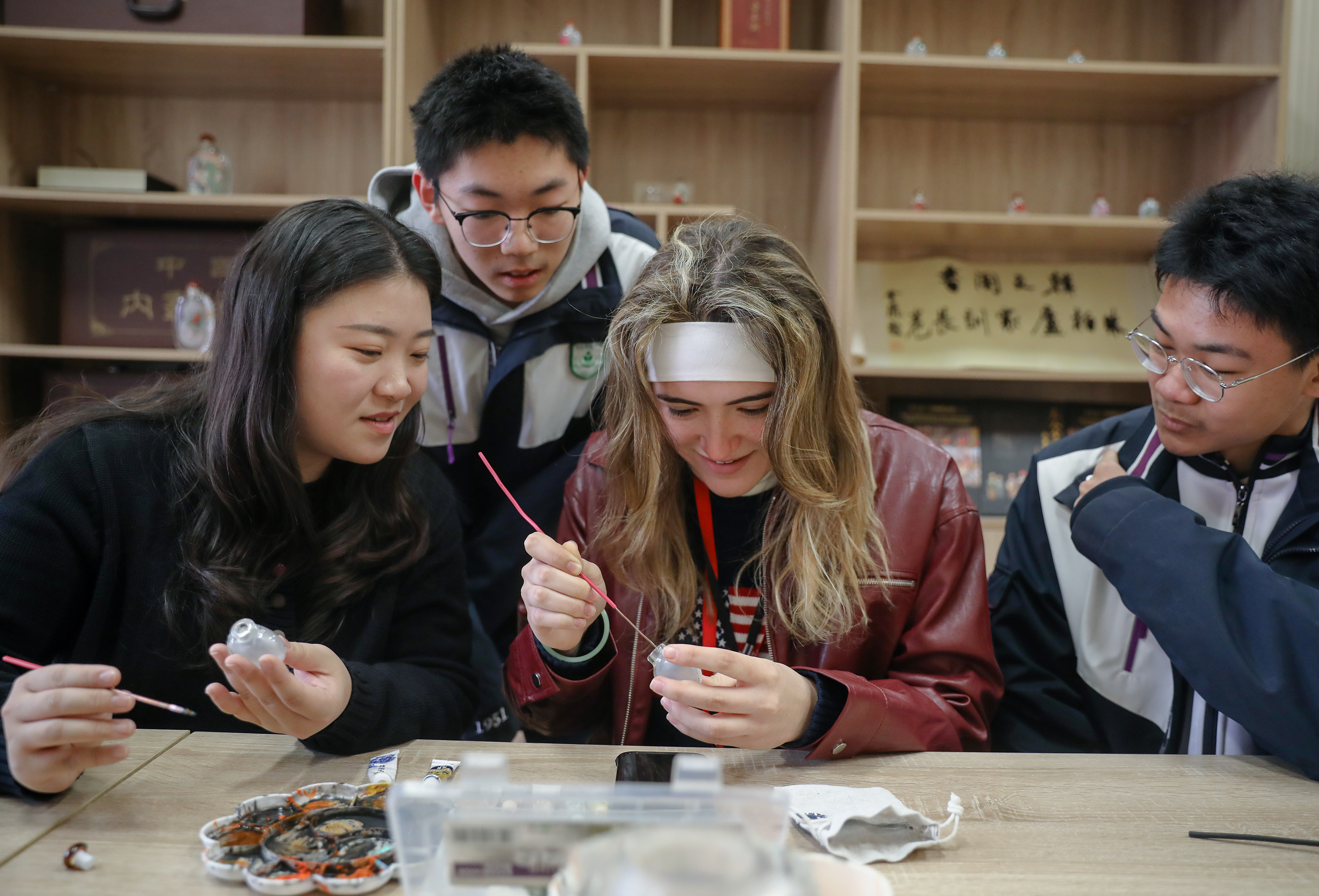 12月27日,来自美国佛罗里达州赛普莱斯湾高中的学生Andrea Contreras(左三)在河北衡水中学内画社团感受内画艺术魅力。