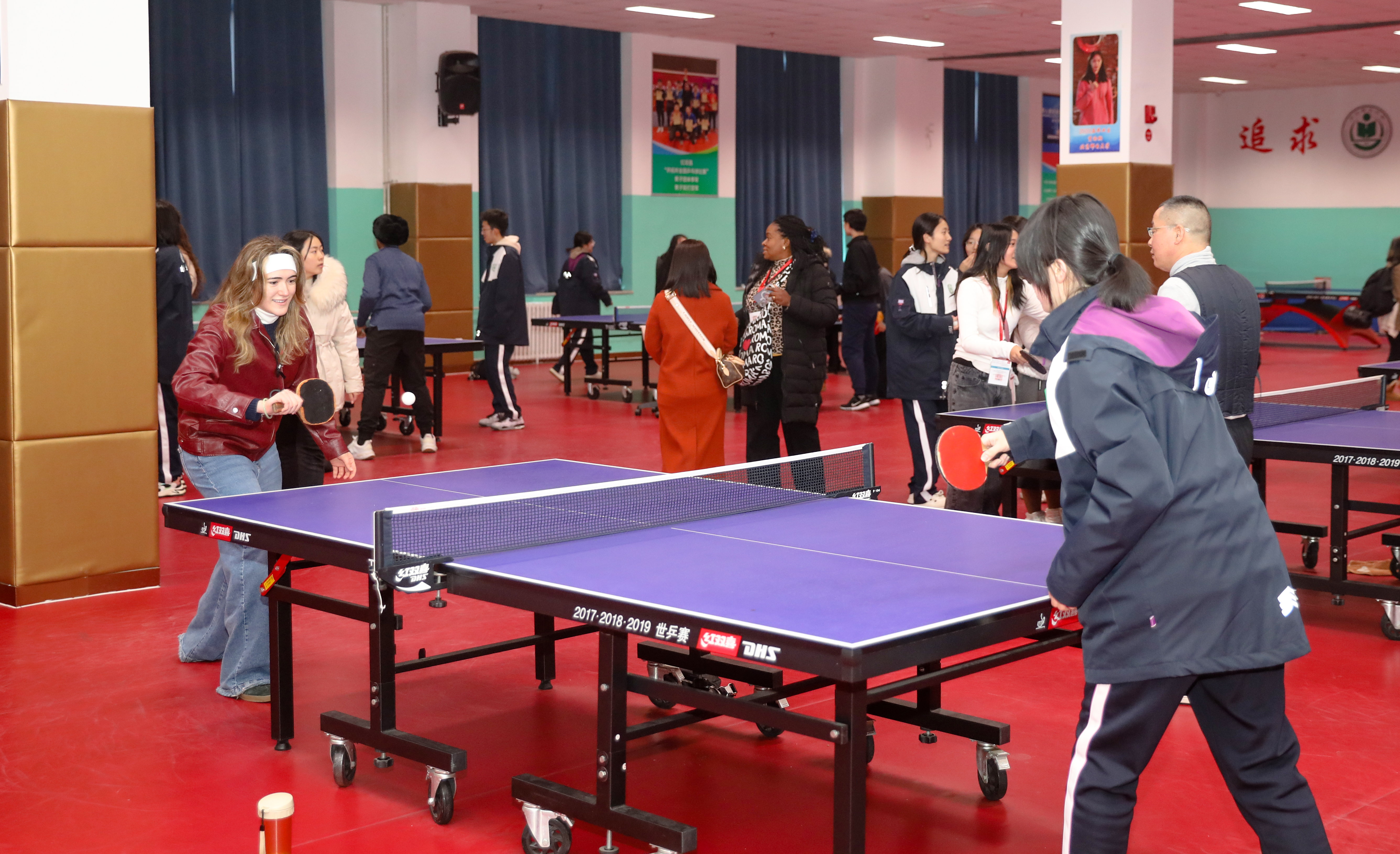 12月27日,来自美国佛罗里达州赛普莱斯湾高中的学生Andrea Contreras(左一)在河北衡水中学体验乒乓球运动。