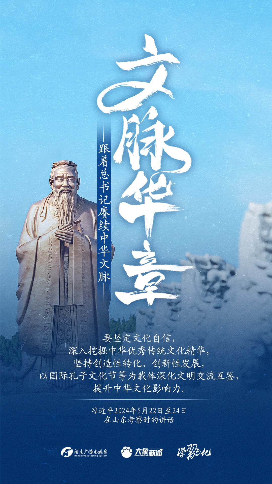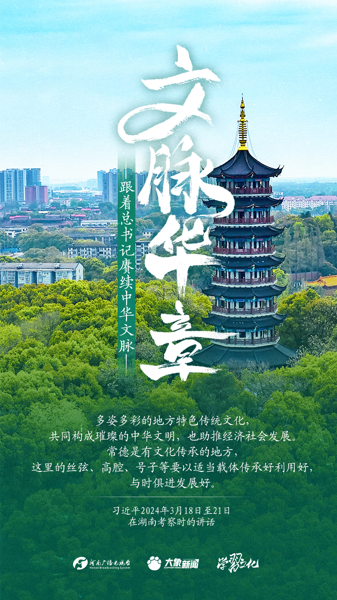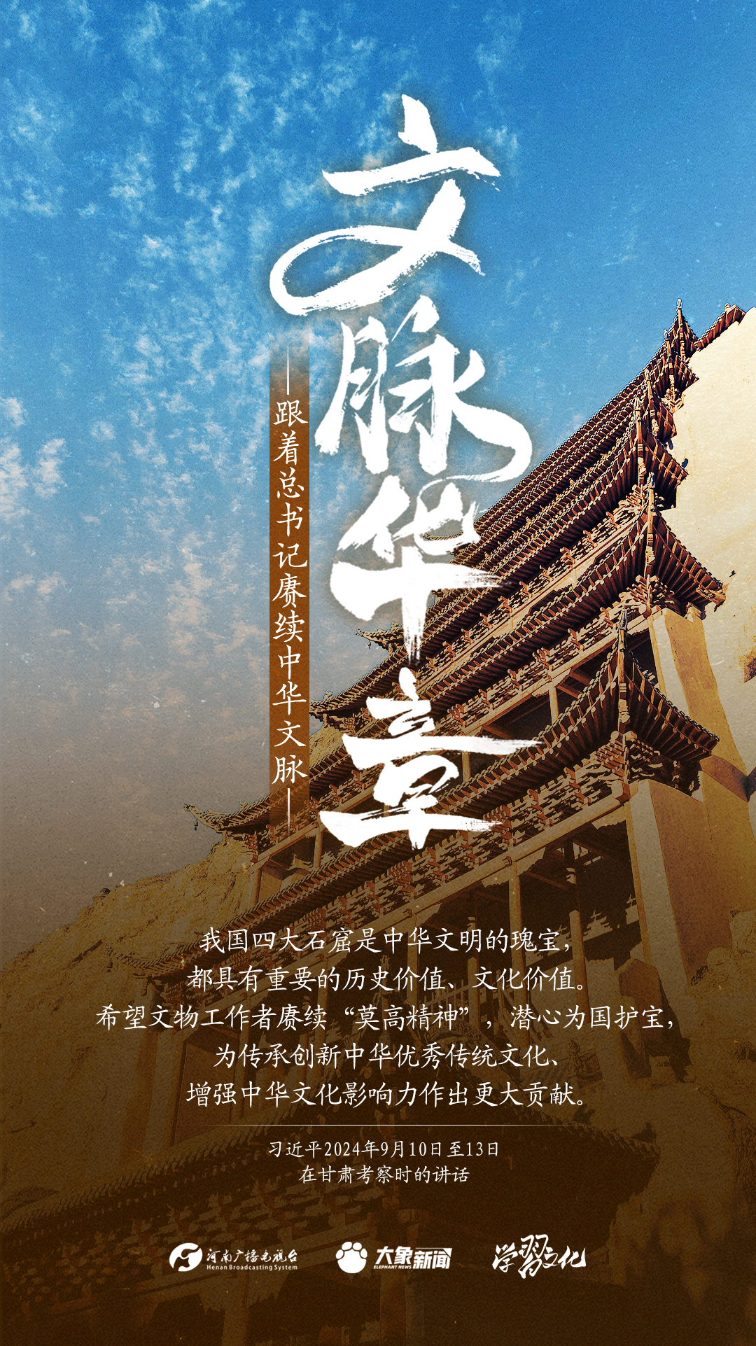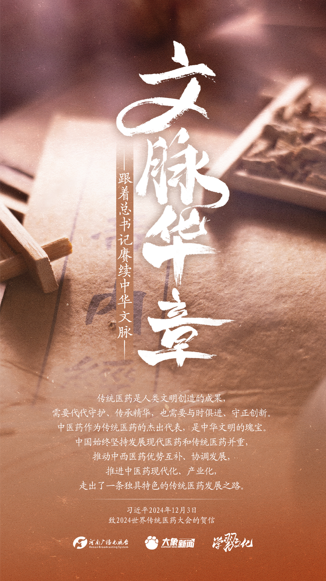 习近平总书记高度重视中华优秀传统文化的继承和弘扬。2024年,总书记一如既往,念兹在兹。在赴地方考察、主持召开重要会议等众多场合,多次对传承发展中华优秀传统文化作出重要讲话重要指示。大象新闻邀您一起,跟着总书记赓续中华文脉,推动中华优秀传统文化创造性转化和创新性发展,在新的起点上继续推动文化繁荣、建设文化强国、建设中华民族现代文明。