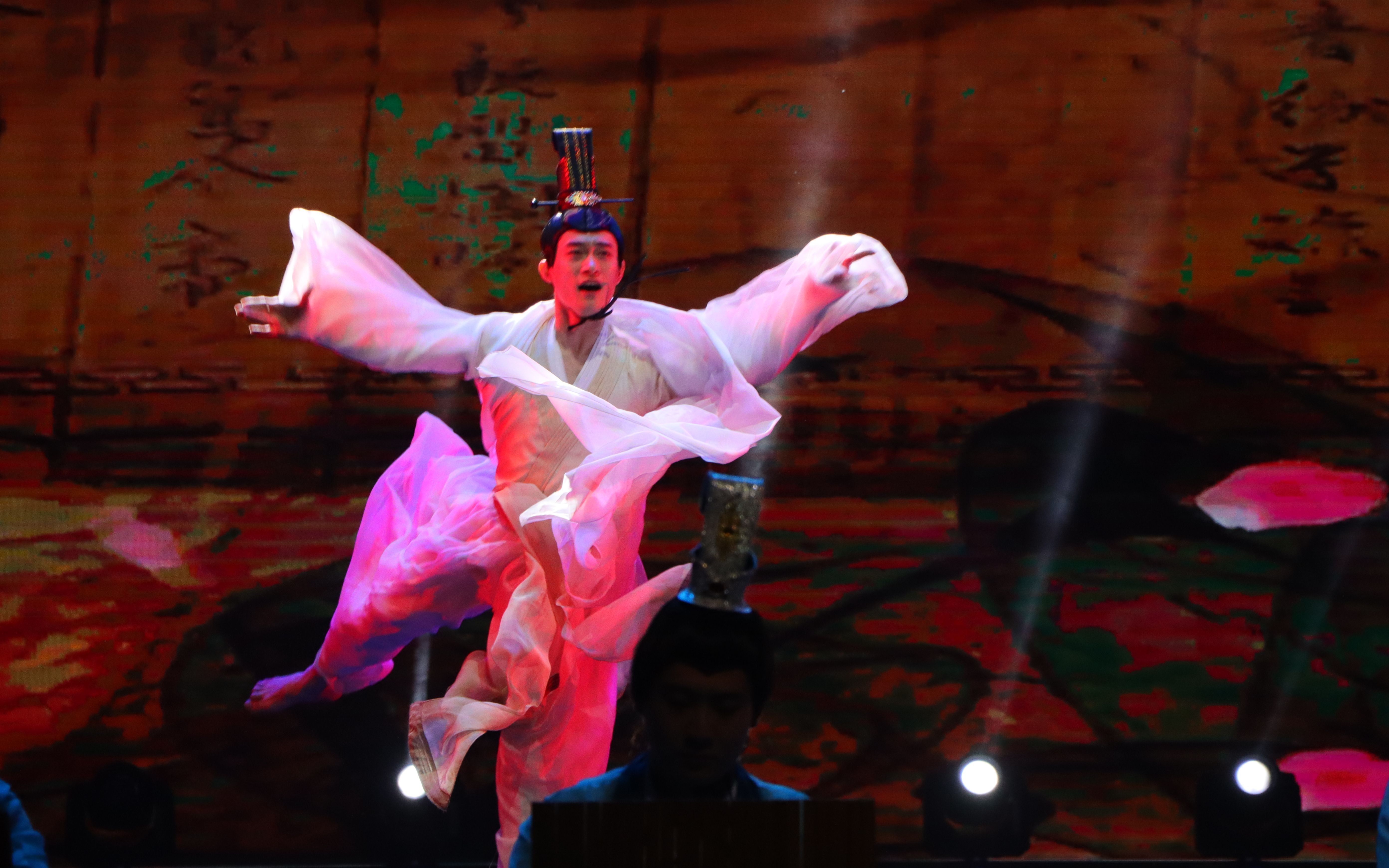 剧中,董仲舒的一生被分为几个关键阶段,每个阶段都通过不同的舞蹈编排和音乐创作,展现了其思想的发展与变化。开场的“目不窥园”章节,通过一段独舞和深情的吟诵,传达了他远离诱惑、专注于学问研究的决心。“下帷讲诵”章节,则通过集体舞和激昂的鼓点,表现了董仲舒公开讲学、弘扬儒学的场景。在“天人感应”“大一统”章节,通过董仲舒与汉武帝对话形式,呈现董仲舒的治国理念。