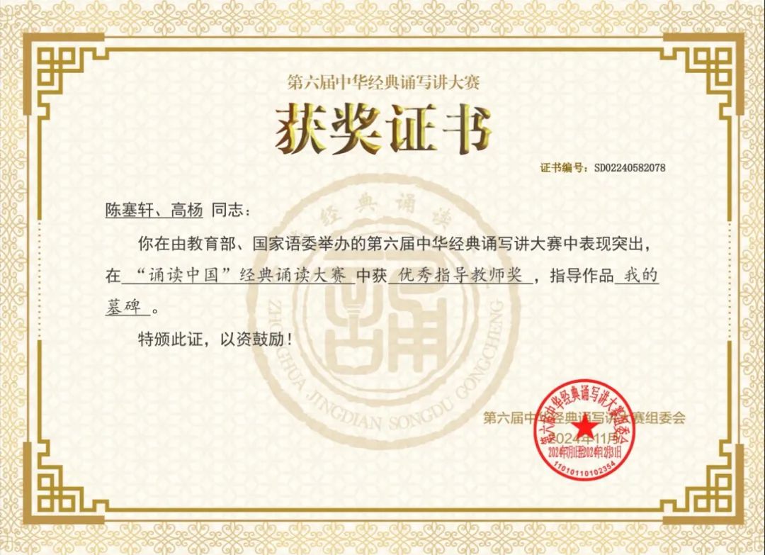 比赛成绩的取得是学校文化教育、美育和校园文化建设的重要成果,将进一步激励广大师生继续在中华经典文化传承和创新上砥砺前行。