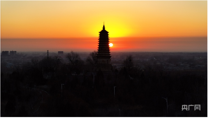 在河北省定兴县,新年的第一轮朝阳从黄金台广场升起,冬日阳光漫洒金台,定兴以新气象、满憧憬,踏上全新征程(央广网发 张曾良 摄)