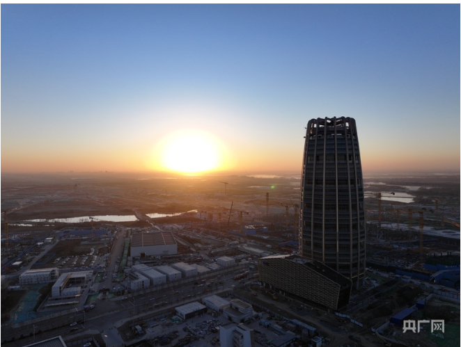 河北雄安新区地标——中国中化总部大厦迎来新年第一缕阳光,这栋被称为“金芦苇”的雄安第一高楼,见证了雄安拔节生长(央广网记者 王艺霖 摄)