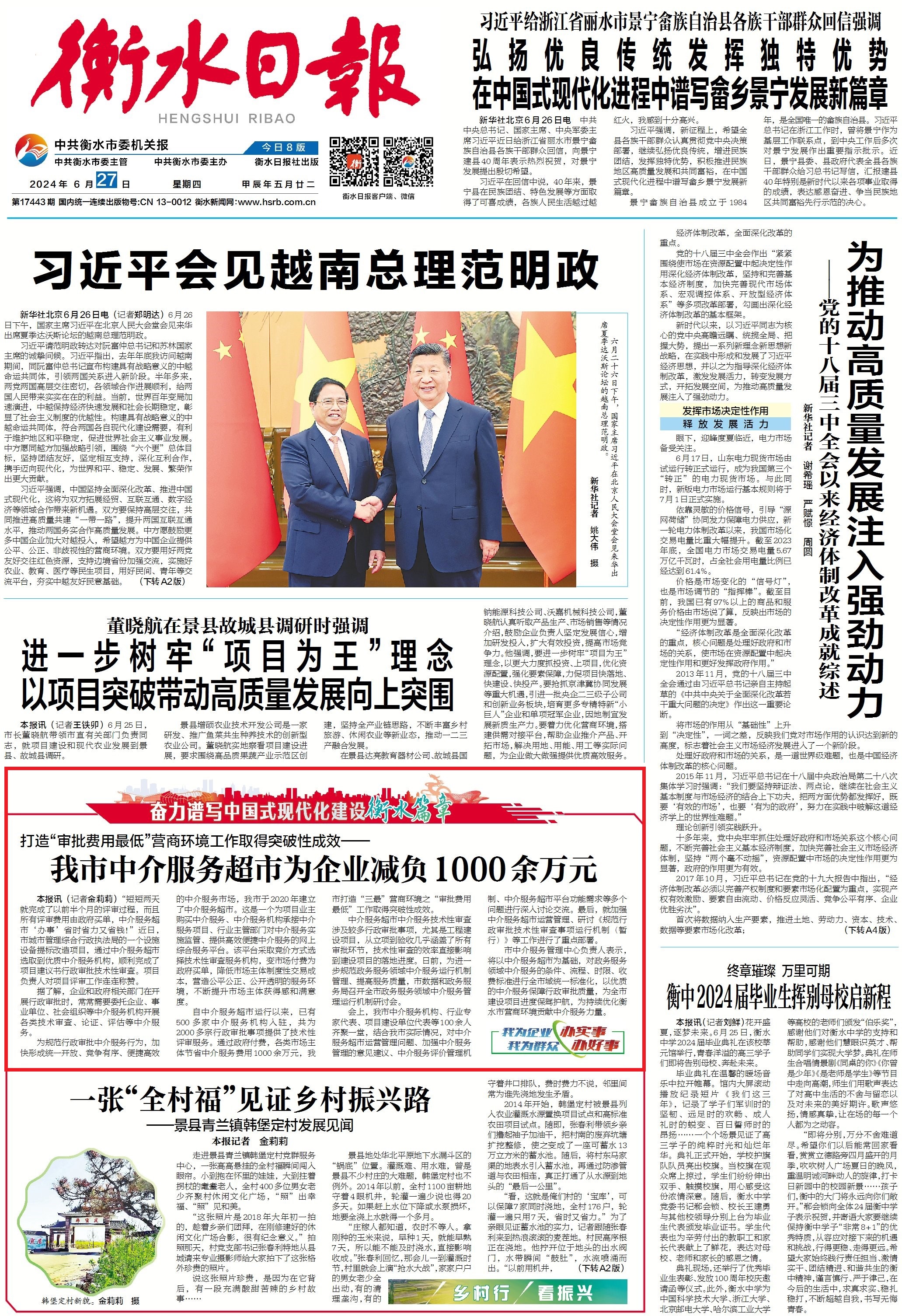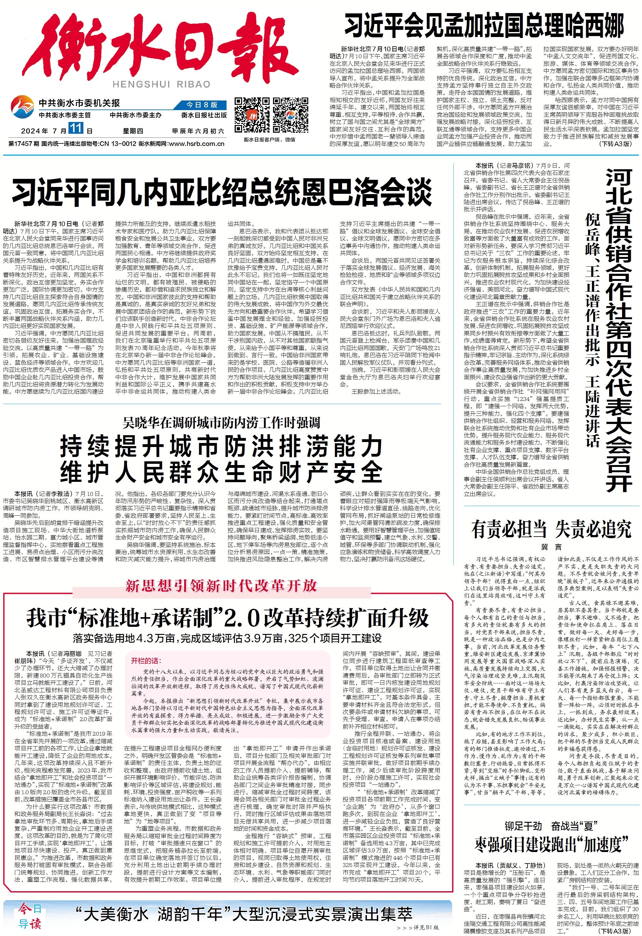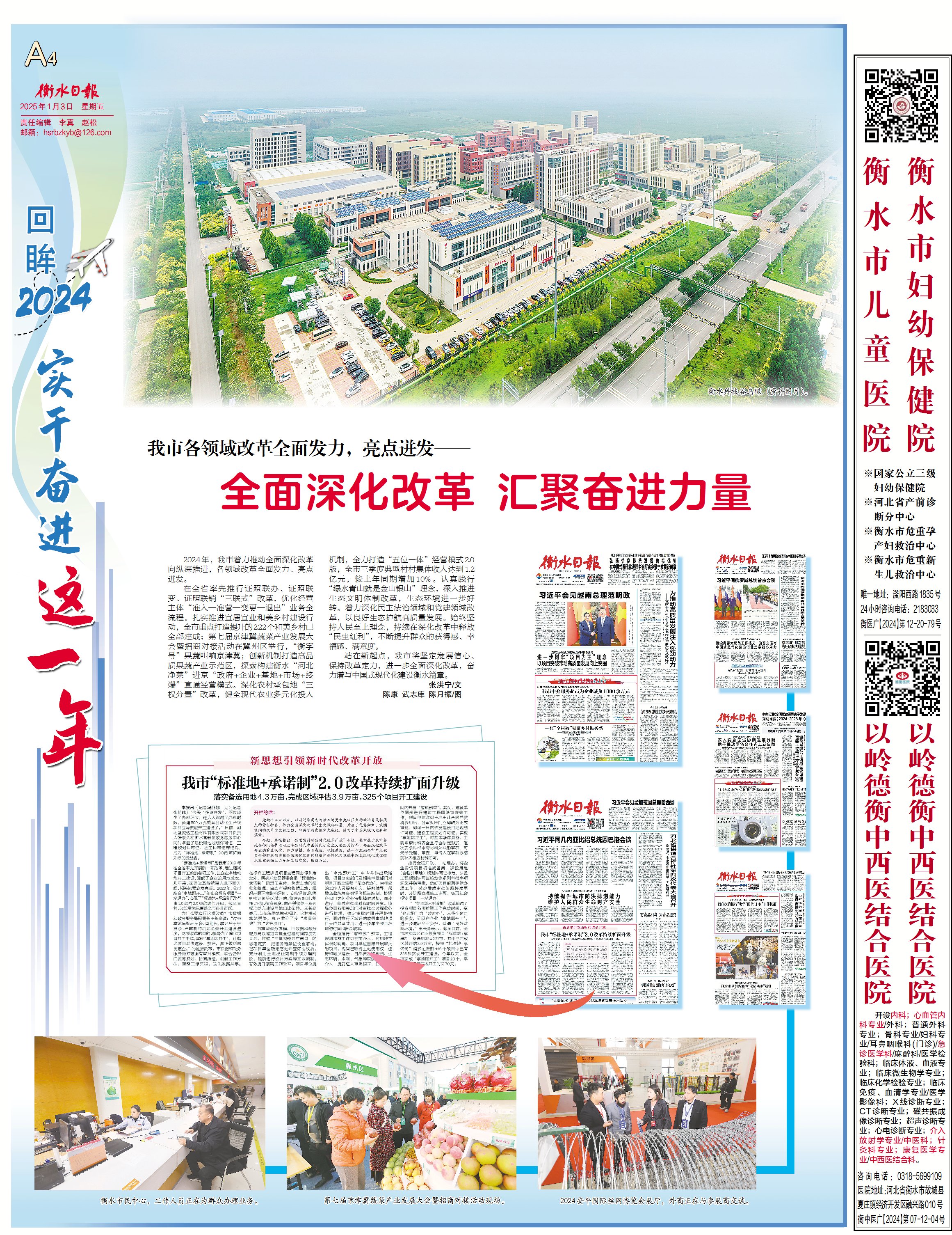 在全省率先推行证照联办、证照联变、证照联销“三联式”改革,优化经营主体“准入一准营一变更一退出”业务全流程。扎实推进宜居宜业和美乡村建设行动,全市重点打造提升的222个和美乡村已全部建成;第七届京津冀蔬菜产业发展大会暨招商对接活动在冀州区举行,“衡字号”果蔬叫响京津冀;创新机制打造高品质果蔬产业示范区,探索构建衡水“河北净菜”进京“政府+企业+基地+市场+终端”直通经营模式。深化农村承包地“三权分置”改革,健全现代农业多元化投入机制,全力打造“五位一体”经营模式2.0版,全市三季度典型村村集体收入达到1.2亿元,较上年同期增加10%。认真践行“绿水青山就是金山银山”理念,深入推进生态文明体制改革,生态环境进一步好转。着力深化民主法治领域和党建领域改革,以良好生态护航高质量发展。始终坚持人民至上理念,持续在深化改革中释放“民生红利”,不断提升群众的获得感、幸福感、满意度。