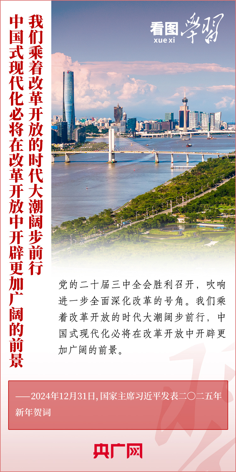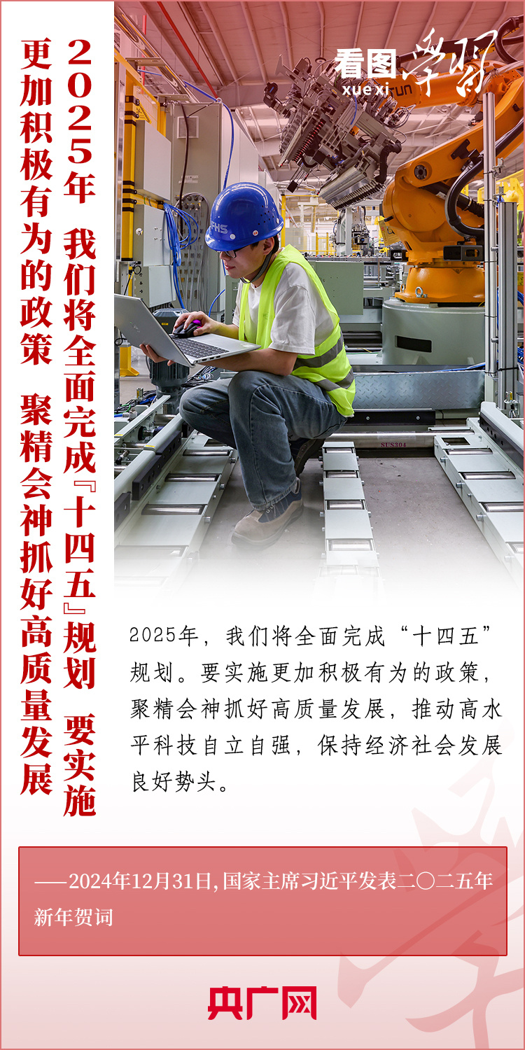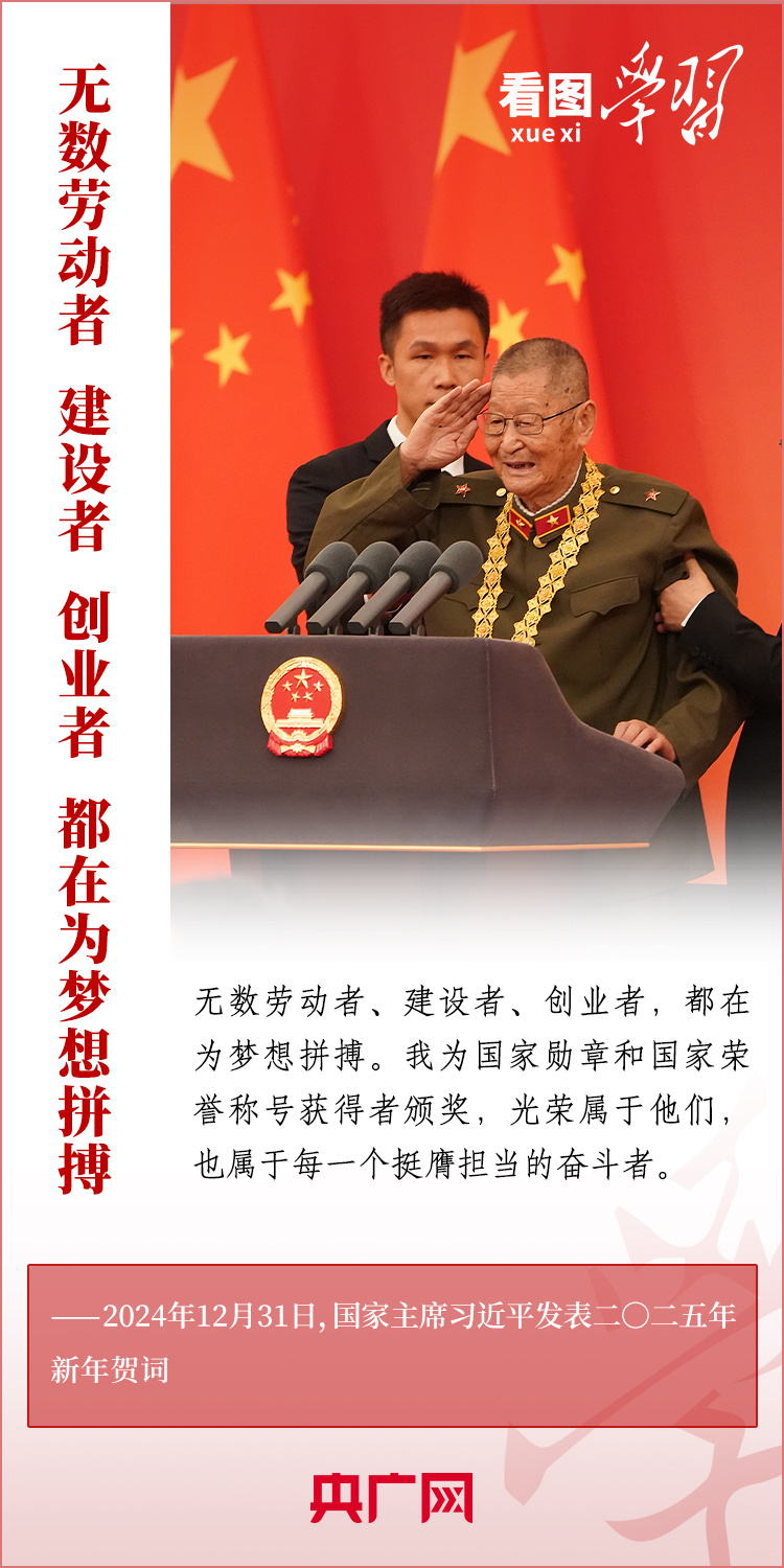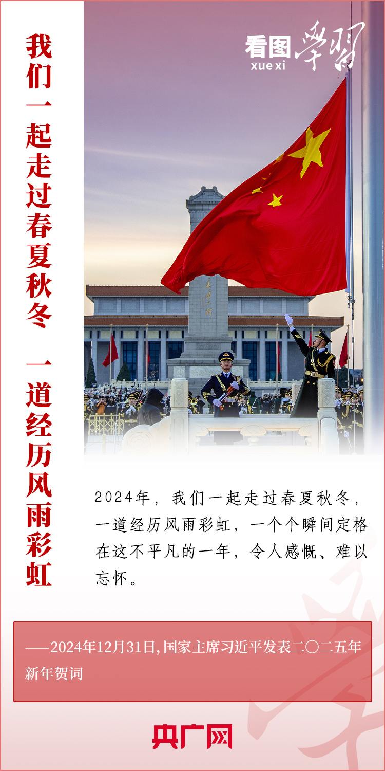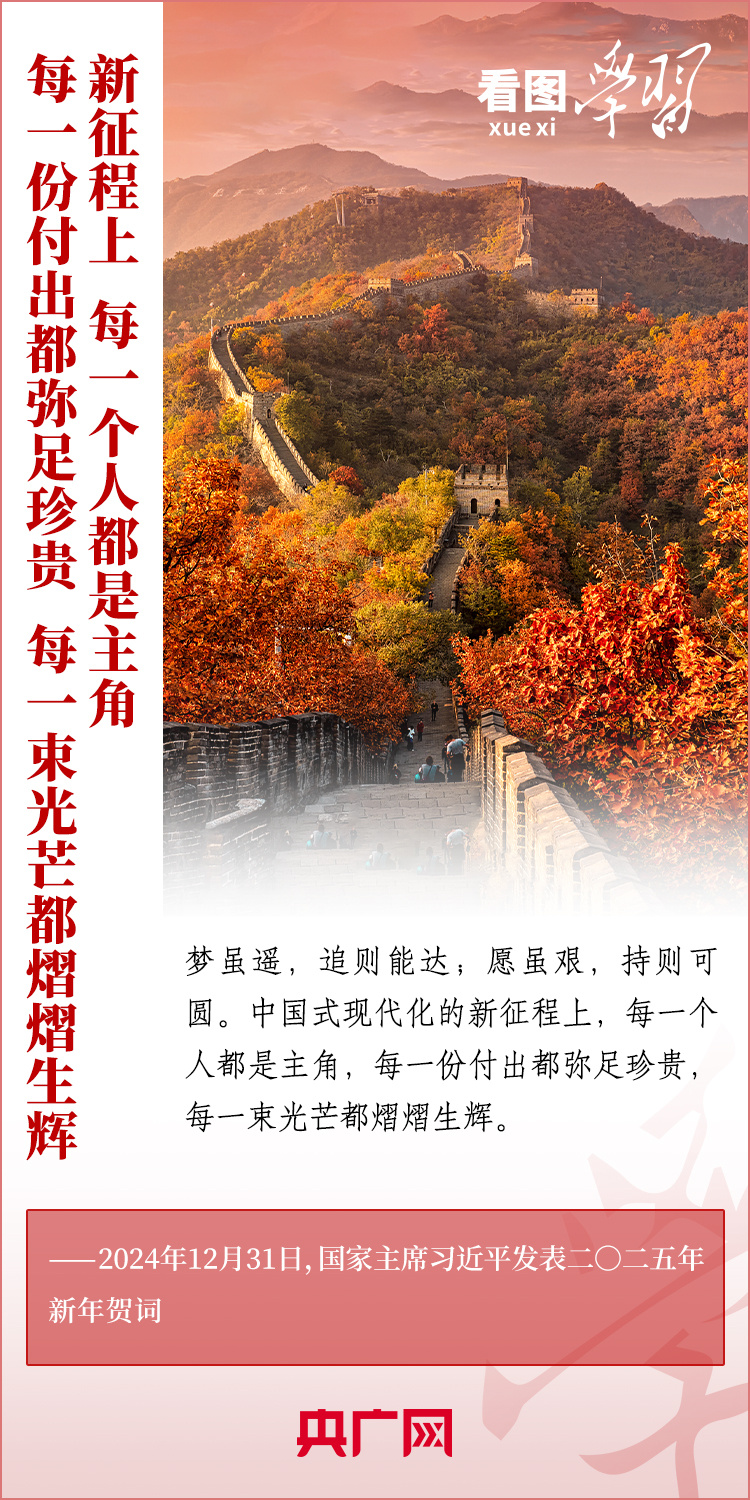 “梦虽遥,追则能达;愿虽艰,持则可圆。”新年前夕,习近平主席发表二〇二五年新年贺词。在温暖有力的讲述中,习主席深情回望过去一年中国不平凡的奋斗历程、精彩瞬间,感慨大家一道经历的风雨彩虹、难忘时刻,赞美无数为梦想拼搏的劳动者、建设者、创业者。习主席说,中国式现代化的新征程上,每一个人都是主角,每一份付出都弥足珍贵,每一束光芒都熠熠生辉。让我们充满信心,在新的一年接续奋斗!