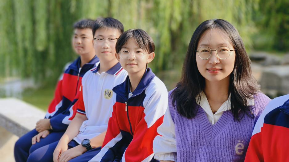 七年级3部主任李淑新(右一)陪孩子们在花园里休息