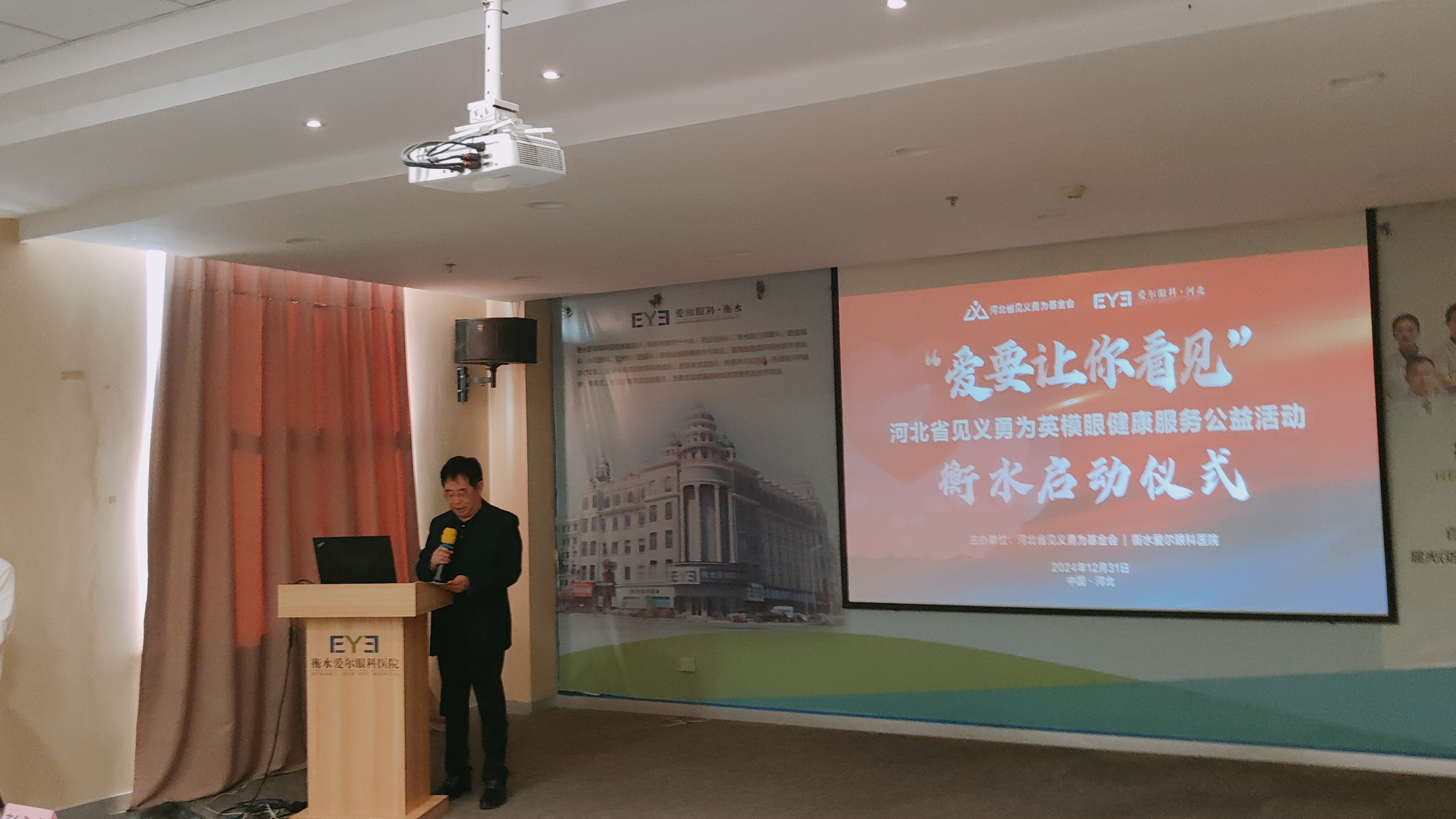 2024年12月31日上午,“爱要让你看见”河北省见义勇为英模眼健康服务公益活动衡水站在衡水爱尔眼科医院启动。活动现场,衡水市见义勇为工作协会会长冀立建、衡水爱尔眼科医院CEO李江涛、衡水爱尔眼科医院院长彭永奎以及见义勇为英雄模范代表共同出席了启动仪式。