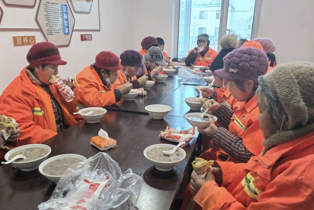 城东社区还贴心地准备了热气腾腾的腊八粥和美味可口的煎饼果子。刚结束清晨清扫工作的环卫工人们手捧着用料满满的早餐,脸上露出了满足的笑容。“这粥熬得真香,喝完浑身都热乎了,干活的疲惫都没了。”一位环卫工人边吃边感慨。