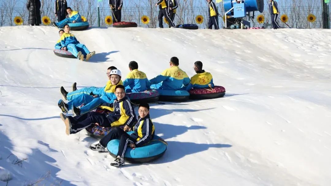 滑雪场内,白雪皑皑,百余名青少年穿好滑雪装备、严阵以待。对于初次接触滑雪的他们来说,雪上的每一个动作都充满了新奇与挑战。在教练的耐心教导和鼓励下,大家勇敢又小心翼翼地迈出了第一步,认真学习动作要领,有序畅快滑行,尽情释放活力,享受在冰雪中驰骋的快乐。紧张、认真的学习之余,大家还体验了趣味雪圈项目,尽享冰雪滑梯带来的“速度与激情”,在欢声笑语中锻炼了团队协作能力。