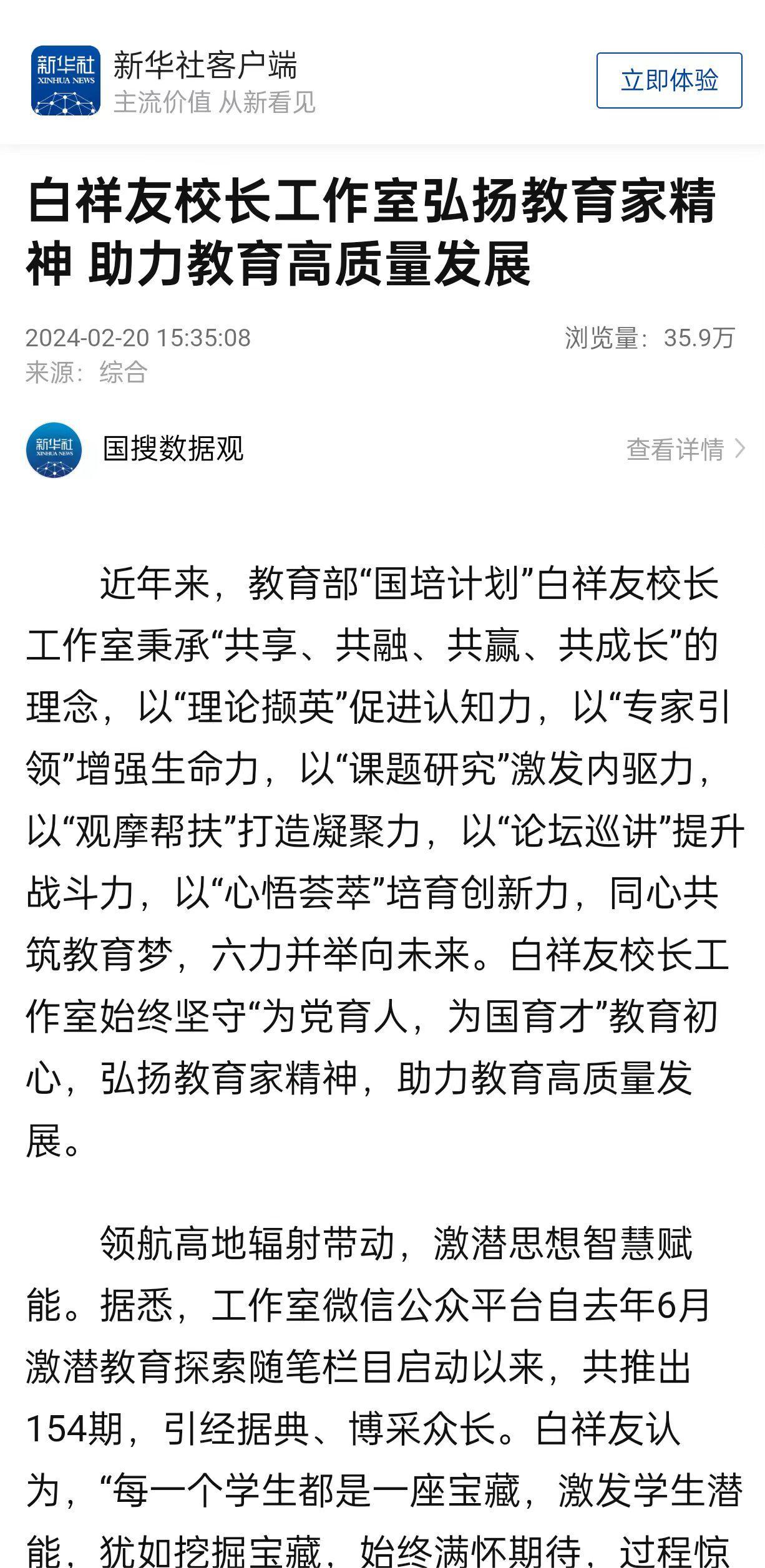 白祥友还受《教育家》杂志邀请,走进线上圆桌论坛,作《深耕奋进文化 赋能内涵发展》专题报告。“白祥友校长工作室”微信公众平台全年推出281期,引经据典、博采众长。新华社客户端、中国网、《河北日报》等众多权威媒体纷纷聚焦激潜教育思想。新华社刊发题为《探索“激爆潜能”领航中学教育》的专题报道。