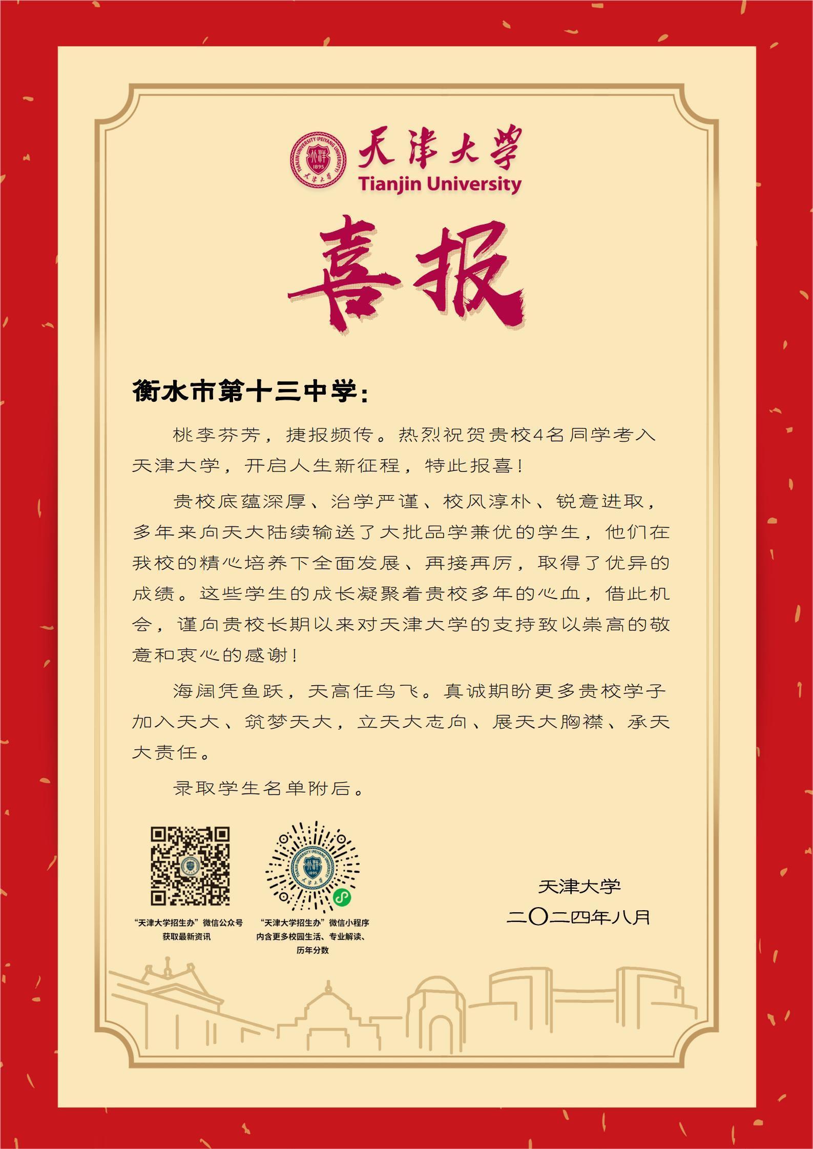 金秋时节,一批批经过三年奋斗实现突破的十三中学子,阔步迈入清华、北京、复旦、南开等名校。清华大学河北招生组组长、清华大学能源动力系刘青教授两次走进衡水十三中。衡水十三中连续四年被清华大学授予“生源中学”荣誉称号。张芙铖、崔鹏飞等8名学生考取“军中清华”——国防科技大学。两个月内,上海交通大学、南京大学等10余所高校派代表走进衡水十三中,并授予“优秀生源基地”称号。厦门大学、天津大学等30余所高校发来喜报,感谢衡水十三中输送大批优秀人才。