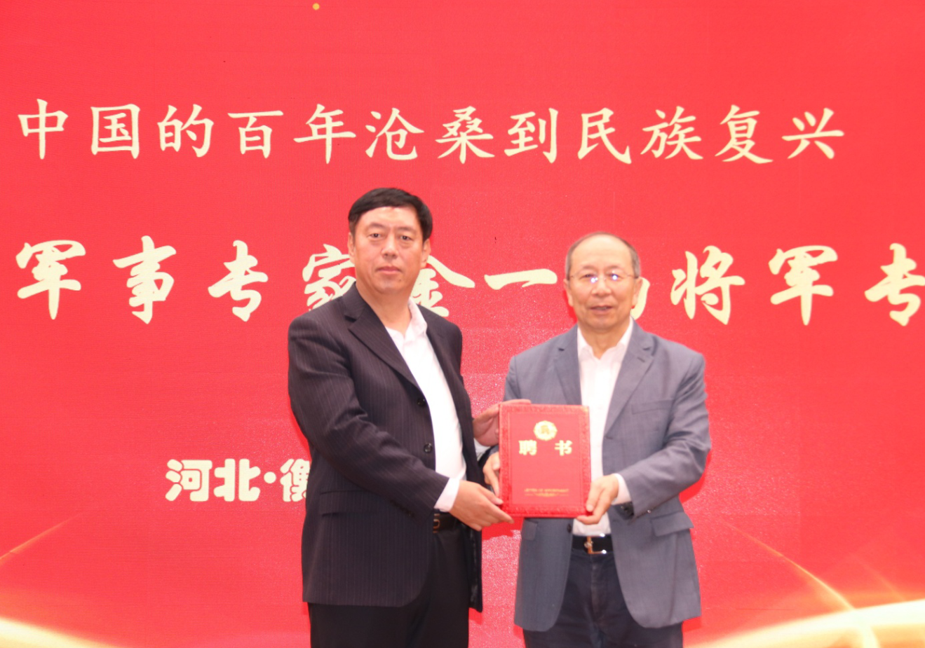 衡水市教育局督学、衡水十三中党委书记白祥友(左)为军事专家金一南将军颁发聘书。