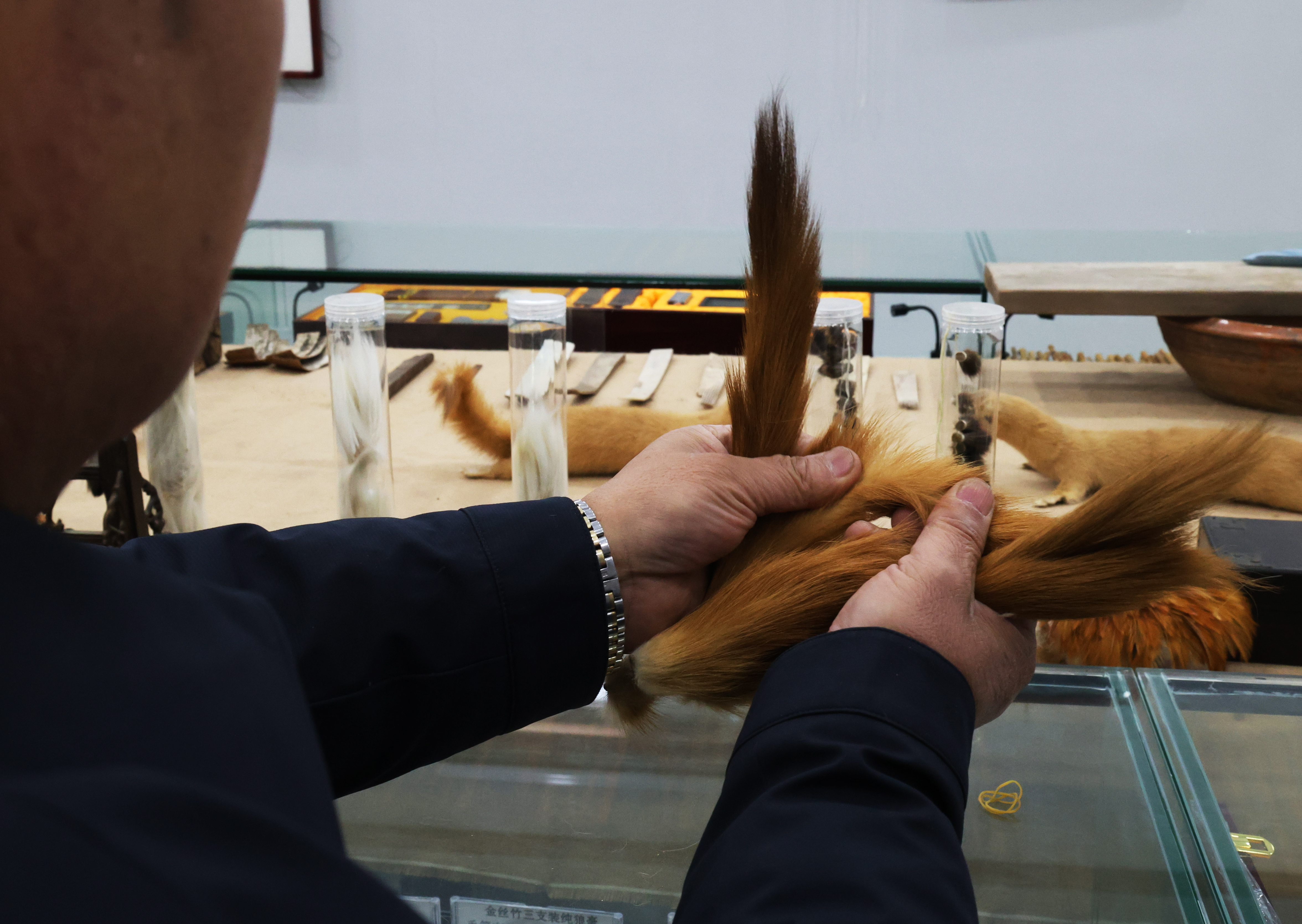 书之佳不佳,笔居其半。一副好的书画作品,除了技法之外,离不开一支做工精良的毛笔。孙占彪介绍,从精选毛发开始到毛笔成型,制作一支毛笔需要水盆、干作、零活3道大工序,78道小工序,繁琐而复杂,非常考验工匠的技艺。首先,选料就很有讲究,毛笔素有“南羊北狼”之说,南派毛笔以湖笔为代表,善制羊毫毛笔,而北方产狼毫,以其制笔的工艺严谨精。“狼毫毛笔最好的原材料来自黄狼尾,以产自保定涞水、涞源的华北路和北京以东的京东条为优。”只见孙占彪抓起一把库存的2018年以前的黄狼尾介绍道,你看这毛条长而密,非常富有弹性,咱们选取它最精华的中间部位作原料,制作出来的毛笔刚柔相济,弹性好还不散尖。