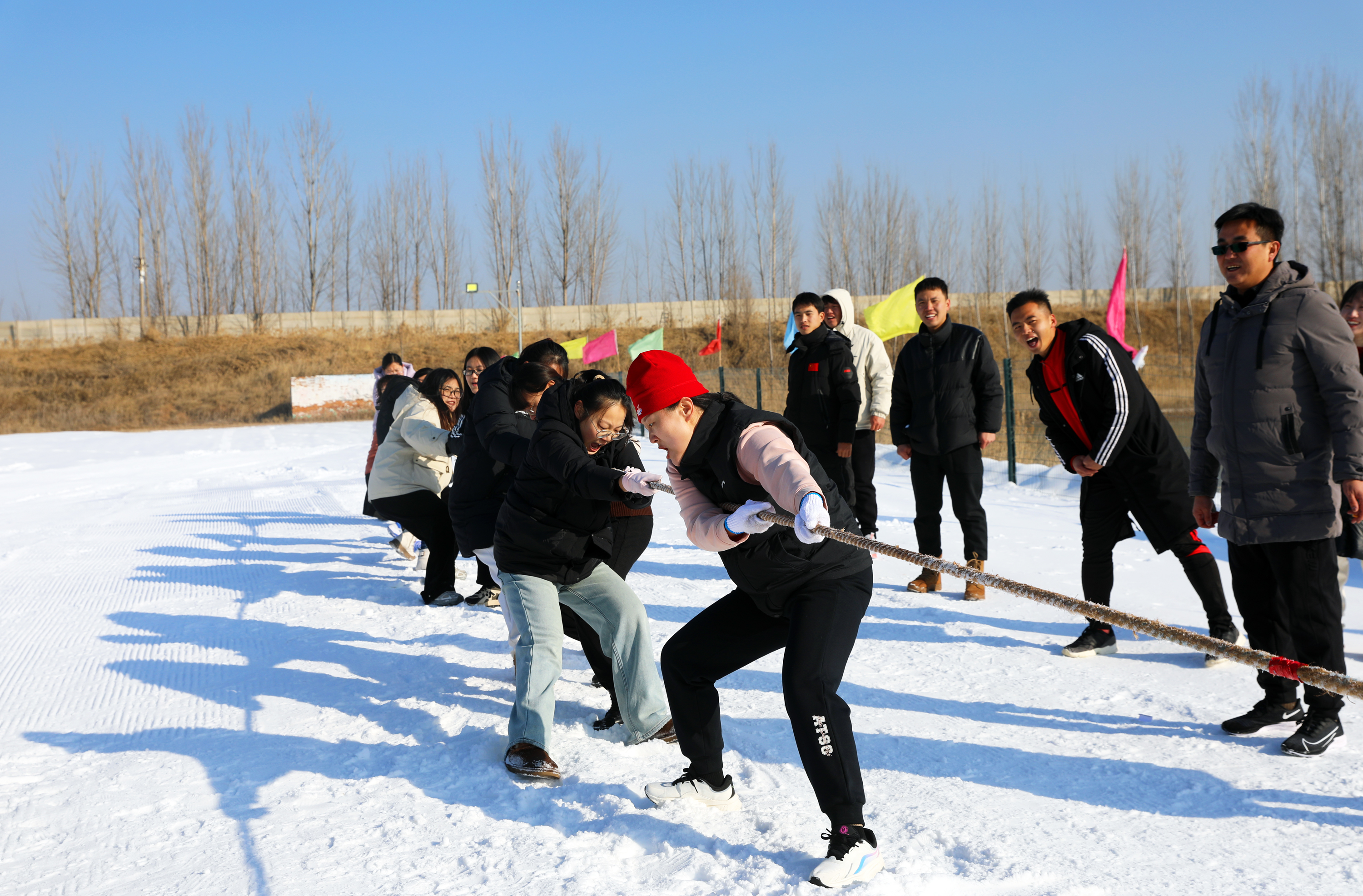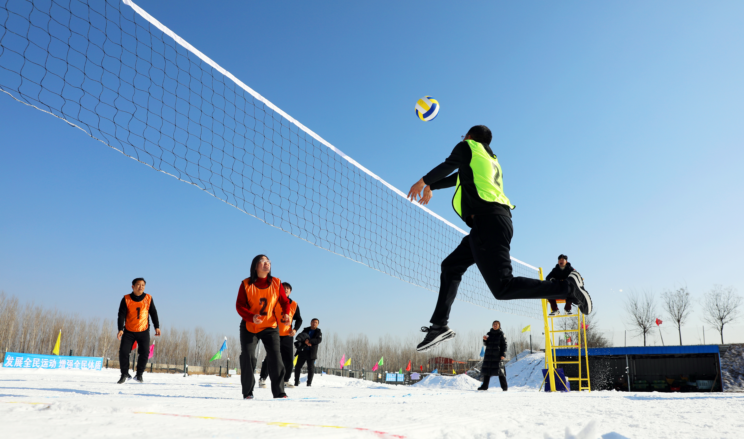 比赛中,冰雪运动爱好者们不畏冬日严寒,团结协作、奋力拼搏。趣味十足的雪地拔河,选手们团结一心,演绎了一场力量与团队的角逐,随着力量来回迁移的准绳,不时引起现场观众连连叫好、加油助威;团队默契的雪地排球,参赛队员们攻防扣拦、奋力扣杀,你来我往,雪地上奋力的救球和巧妙的配合将比赛推向一个又一个高潮;飞旋而下的双板滑雪,选手们在雪道上演绎着属于自己的“速度与激情”,展现出高超的滑雪水平。各项比赛精彩纷呈,在银装素裹的冰雪世界里,到处洋溢着欢声笑语。