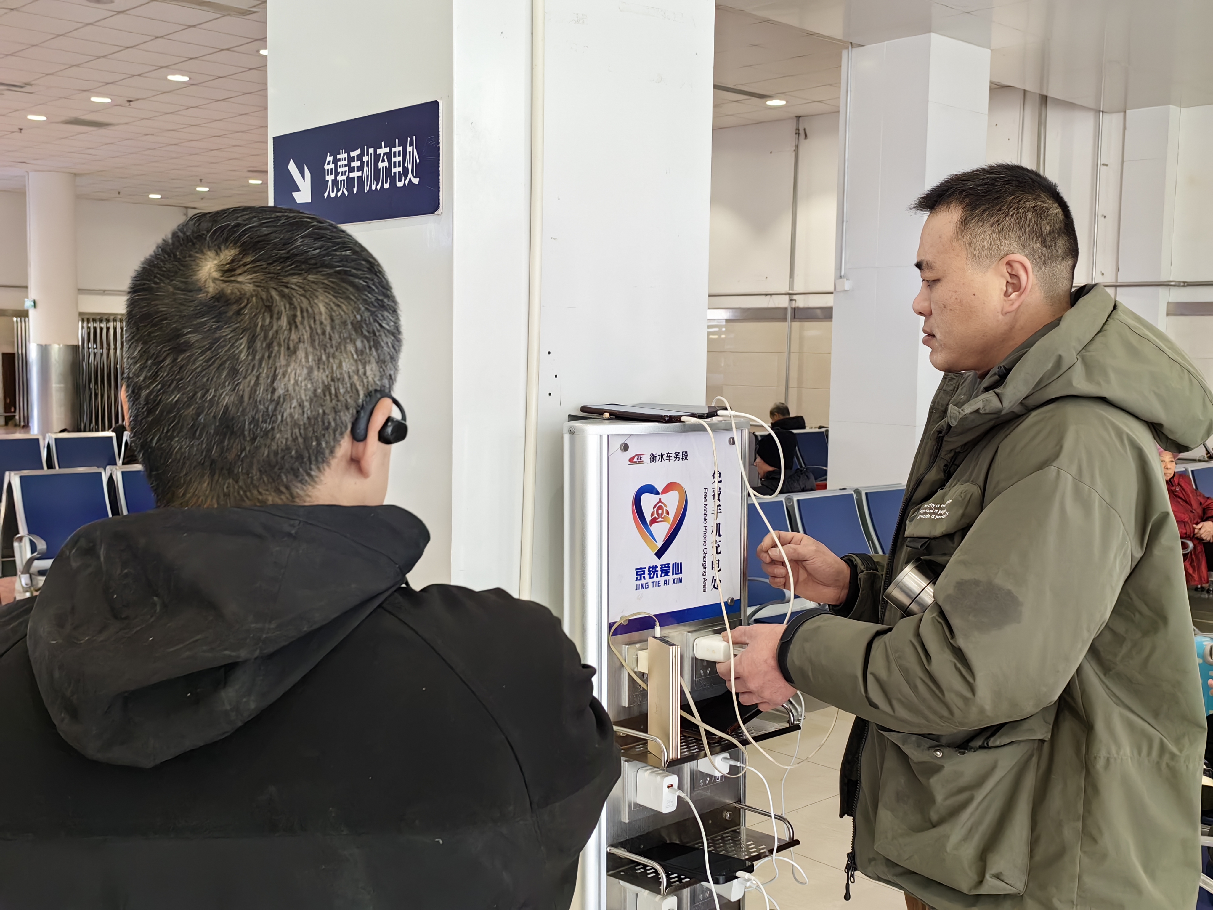 今年春运期间,衡水火车站推出多项便民利民服务:采取空调暖气“双重供暖”保持舒适室温,在候车室钢制座椅加装软垫,增加手机免费充电设备。增设第三卫生间,服务特殊旅客。在5个站台新装“爱心座椅”,供老幼病残孕等旅客候车时使用。安装了验证闸机,遇有高峰日大客流随时启用,方便旅客快速进站,也作为进出站绿色通道,方便特殊旅客使用。继续提供“爱心卡”免费进站接送亲友服务。还组建了党团员“义务奉献小分队”,加强候车室巡视和站台乘降组织,解答旅客问询、提供服务引导、帮扶急难旅客。“我们将全力以赴,为旅客提供舒心、安全的出行体验。”周胜军说。