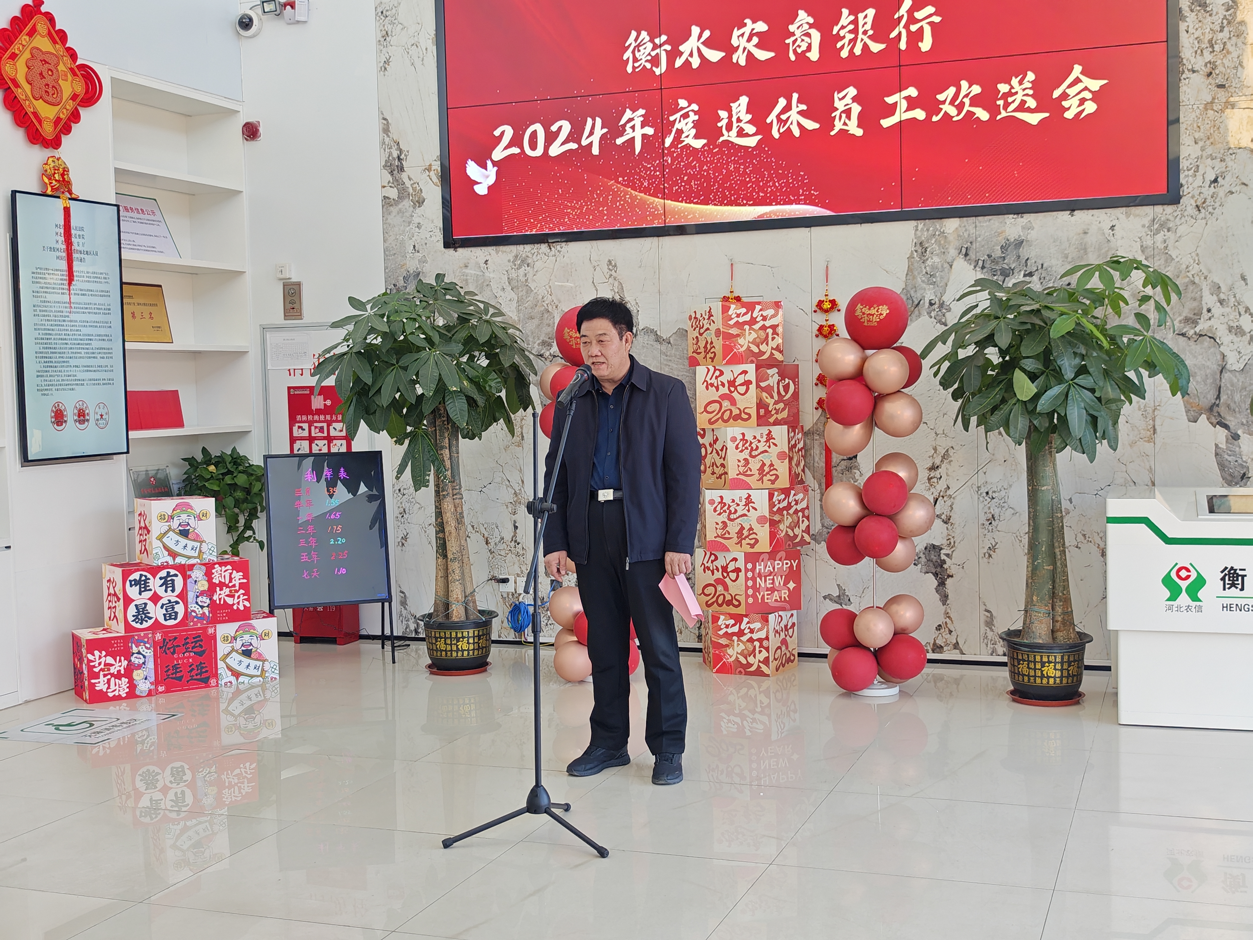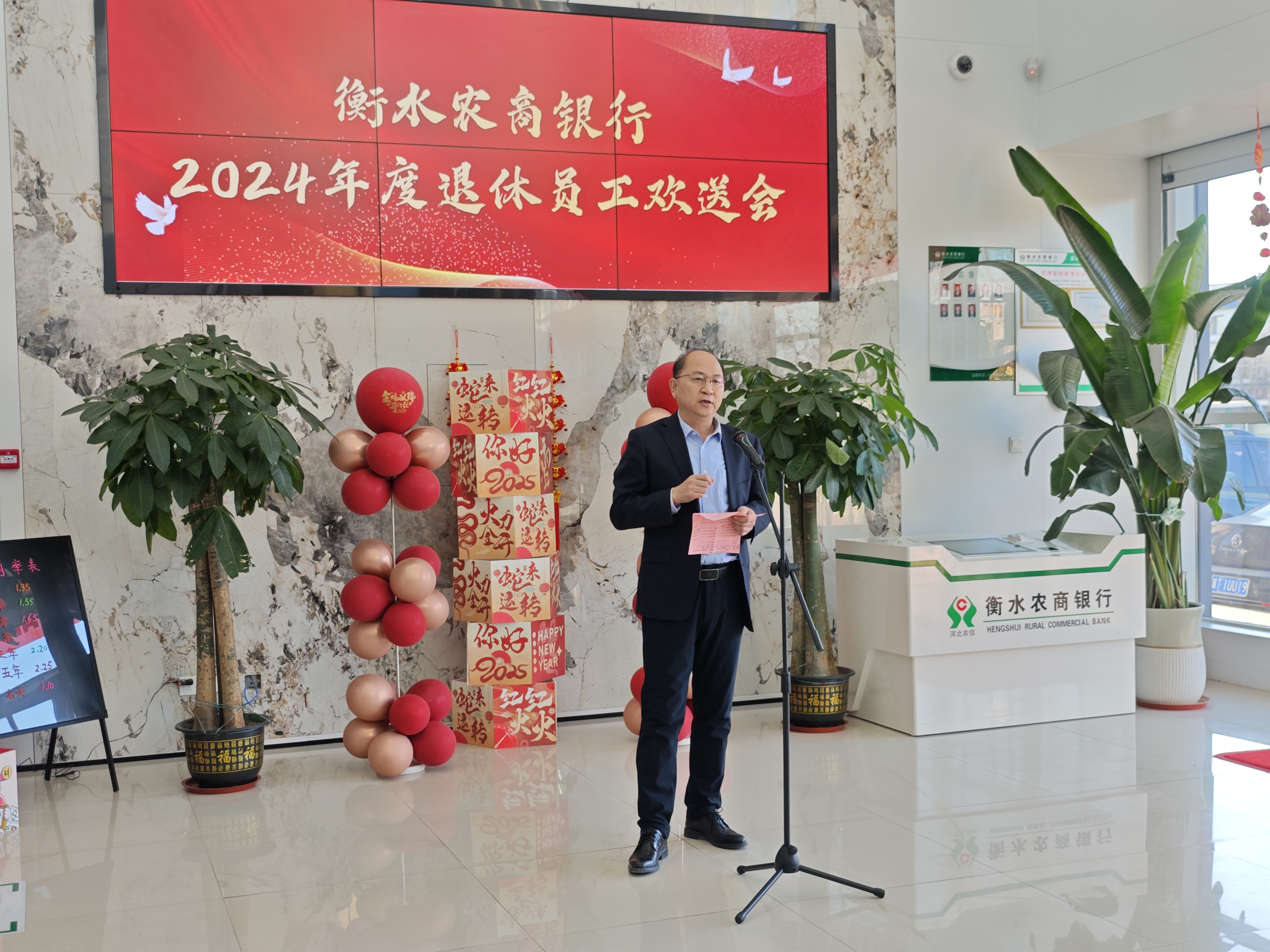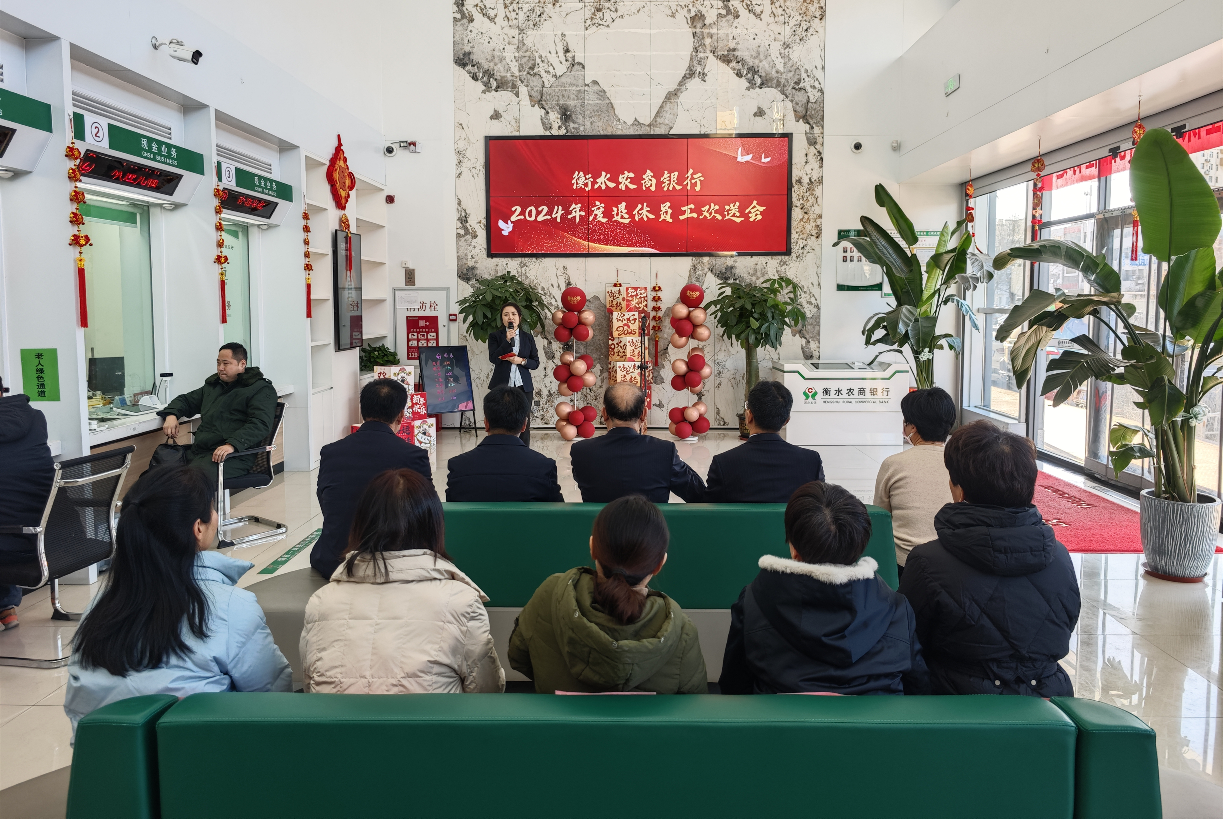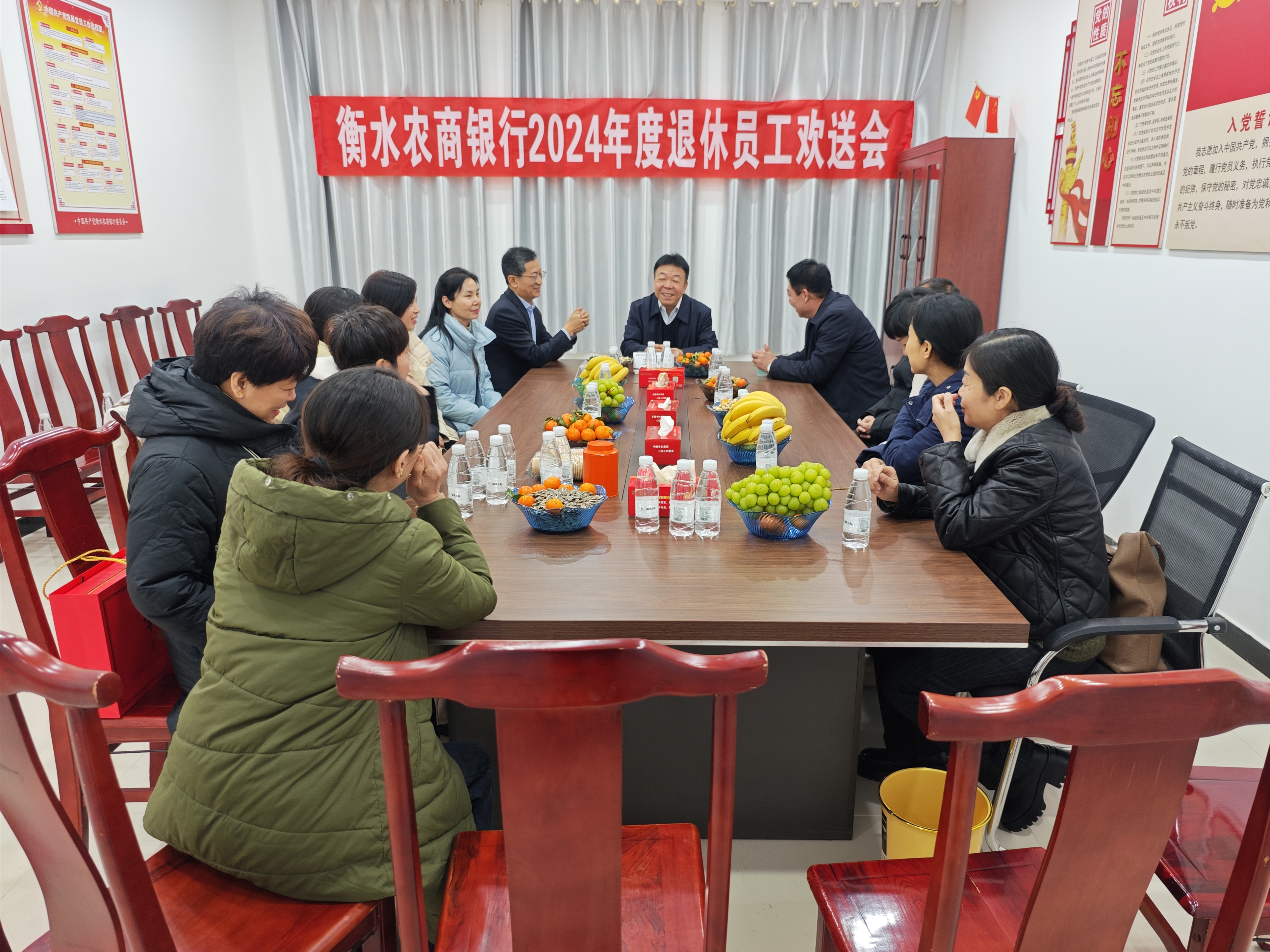 日前,衡水农商银行举办了2024年度退休员工欢送会。衡水农商银行党委书记、董事长冯占中,党委副书记、监事长王建武,董事会秘书丁龙辉,退休员工代表及相关部门负责人出席。