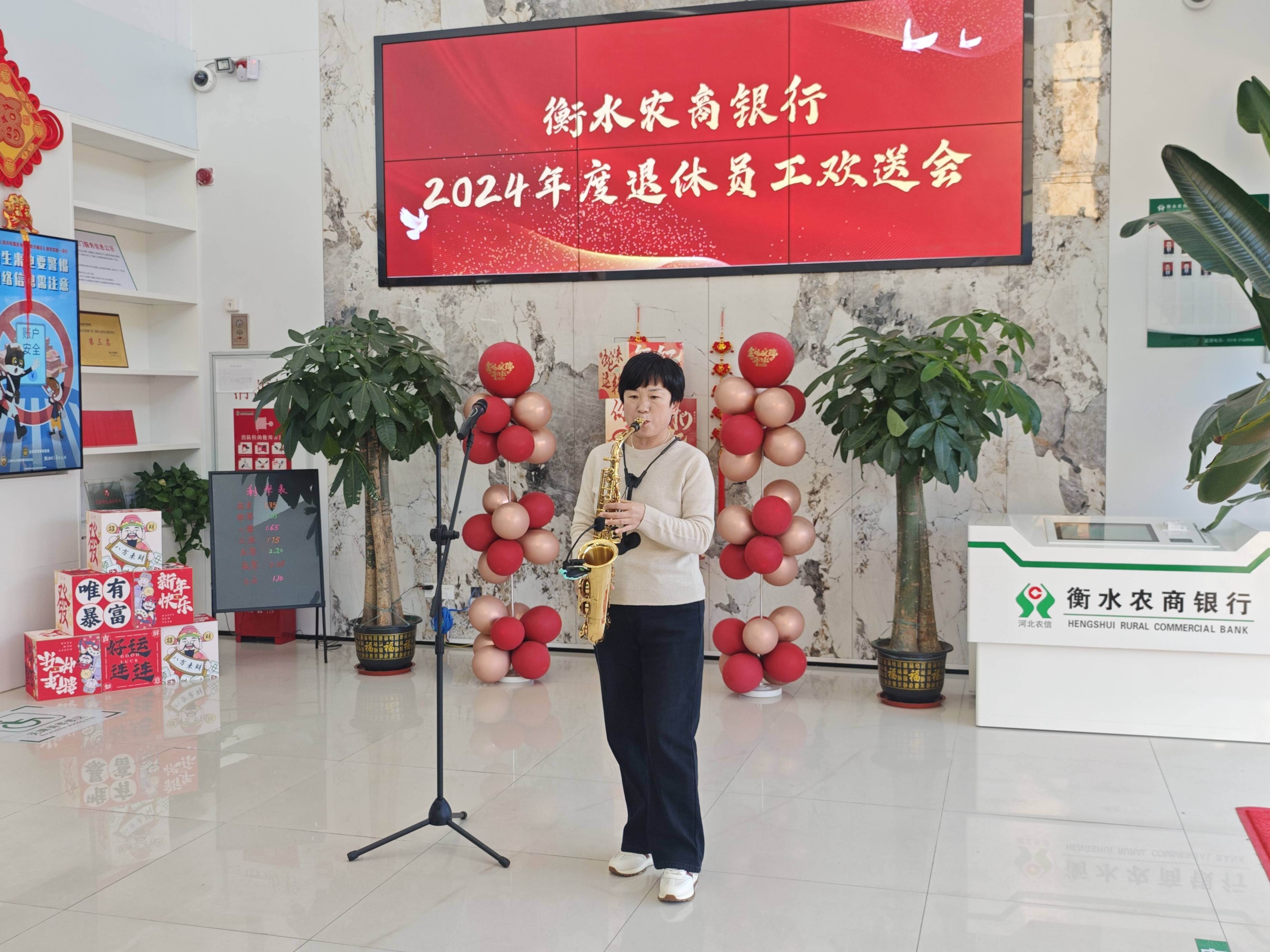 退休员工代表发言,回顾了数十载工作历程,表达了对衡水农商银行未来发展的美好祝愿。期间,退休职工带来萨克斯独奏《绣红旗》,旋律悠扬,将欢送会推向高潮,赢得阵阵掌声。