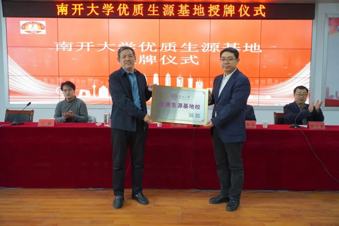 在在场师生的见证下,两校举行了“优质生源基地”授牌仪式。仪式结束后,南开大学于航老师作了精彩的专题报告。他为大家详细介绍了南开大学的文化传统、校园环境、学科发展、师资力量、科研实力、杰出校友以及招生政策等内容,使同学们进一步了解了南开大学,也坚定了他们考入南开大学的决心和信心。