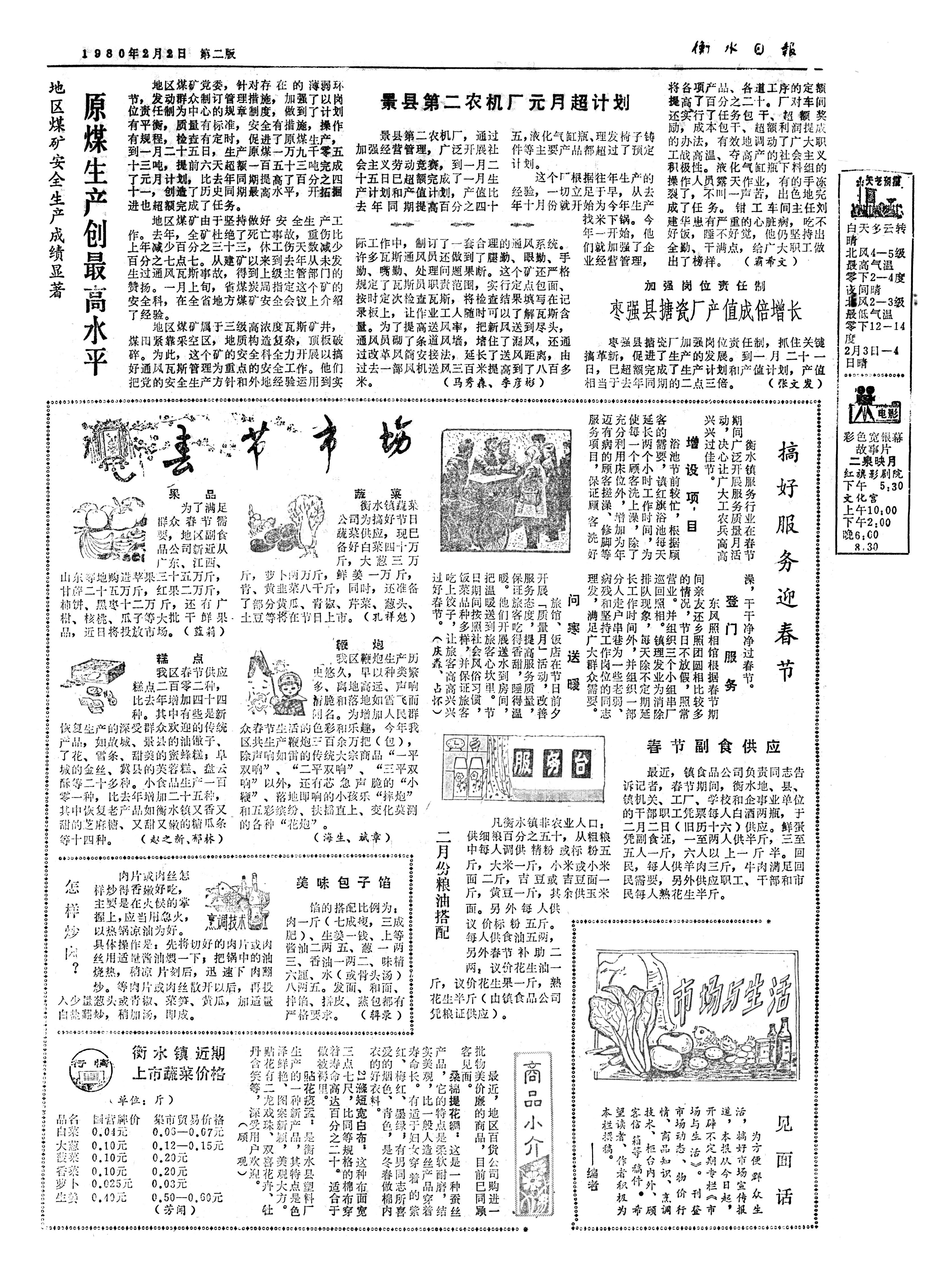 1979年1月17日《衡水日报》1版:今年衡水镇的春节市场安排,每人供应猪肉三斤;酒菜、扒鸡、白条鸡、松花蛋敞开供应……去年春节安排鲜蛋一万八千斤,今年安排二万五千斤。深县百货公司购进了小孩喜欢的小花布,青年人爱穿的四季蓝,学生欢迎的草绿装,还有深受老太太喜爱的毛蓝布。1980年2月2日2版:春节期间,衡水地、县、镇机关、工厂、学校和企事业单位的干部职工凭票每人白酒两瓶。鲜蛋凭副食证,一至两人供半斤,三至五人一斤,六人以上一斤半……另外供应职工、干部和市民每人熟花生半斤。《二月份粮油搭配》:凡衡水镇非农业人口,供细粮百分之五十。每人供食油五两,另外春节补助二两,议价花生油一斤,议价花生果一斤。