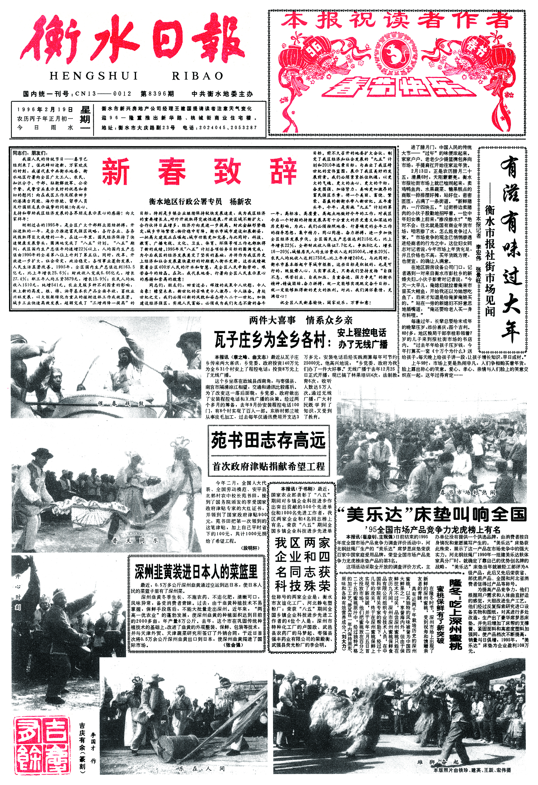 1996年2月19日《衡水日报》1版刊登《有滋有味过大年》,描述衡水市报社街市场的春节新气象,展示了爱心、孝心、亲情交织的浓浓暖意。有市民购买《十万个为什么》送给孩子增长知识,显示了人们对教育的重视、对精神生活的追求。