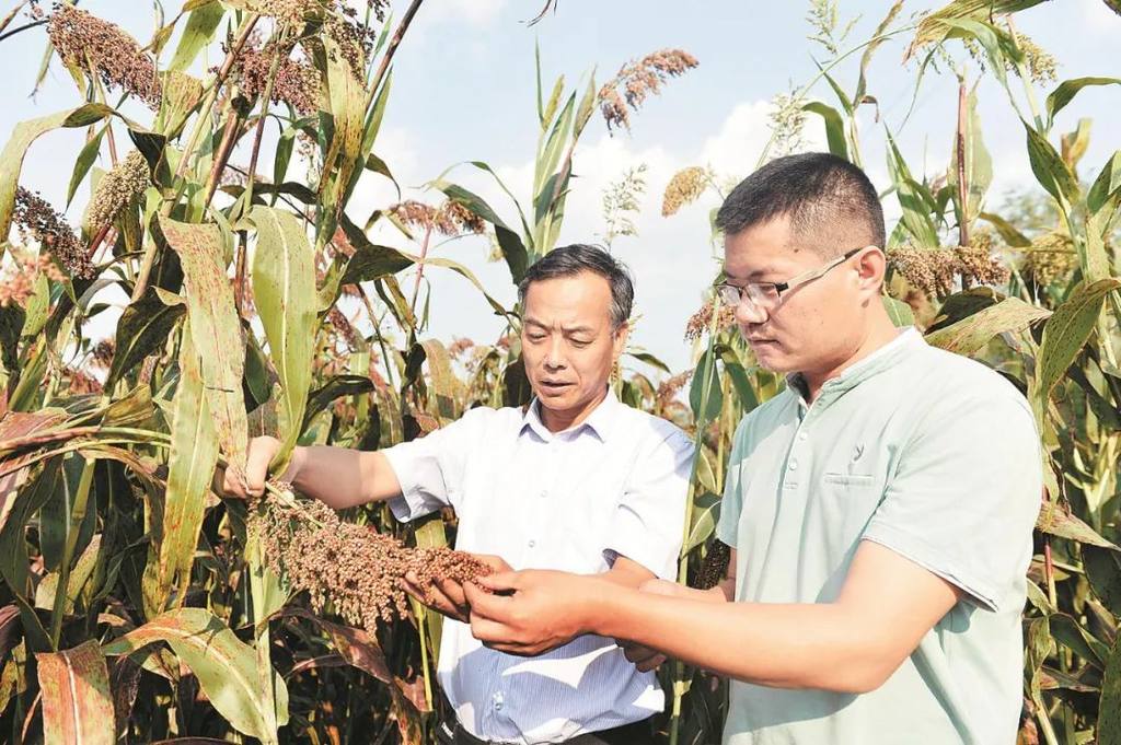2018年9月10日,刘小京(左)在中科院南大港盐碱旱地丰产高效示范基地内查看高粱长势。(资料片)