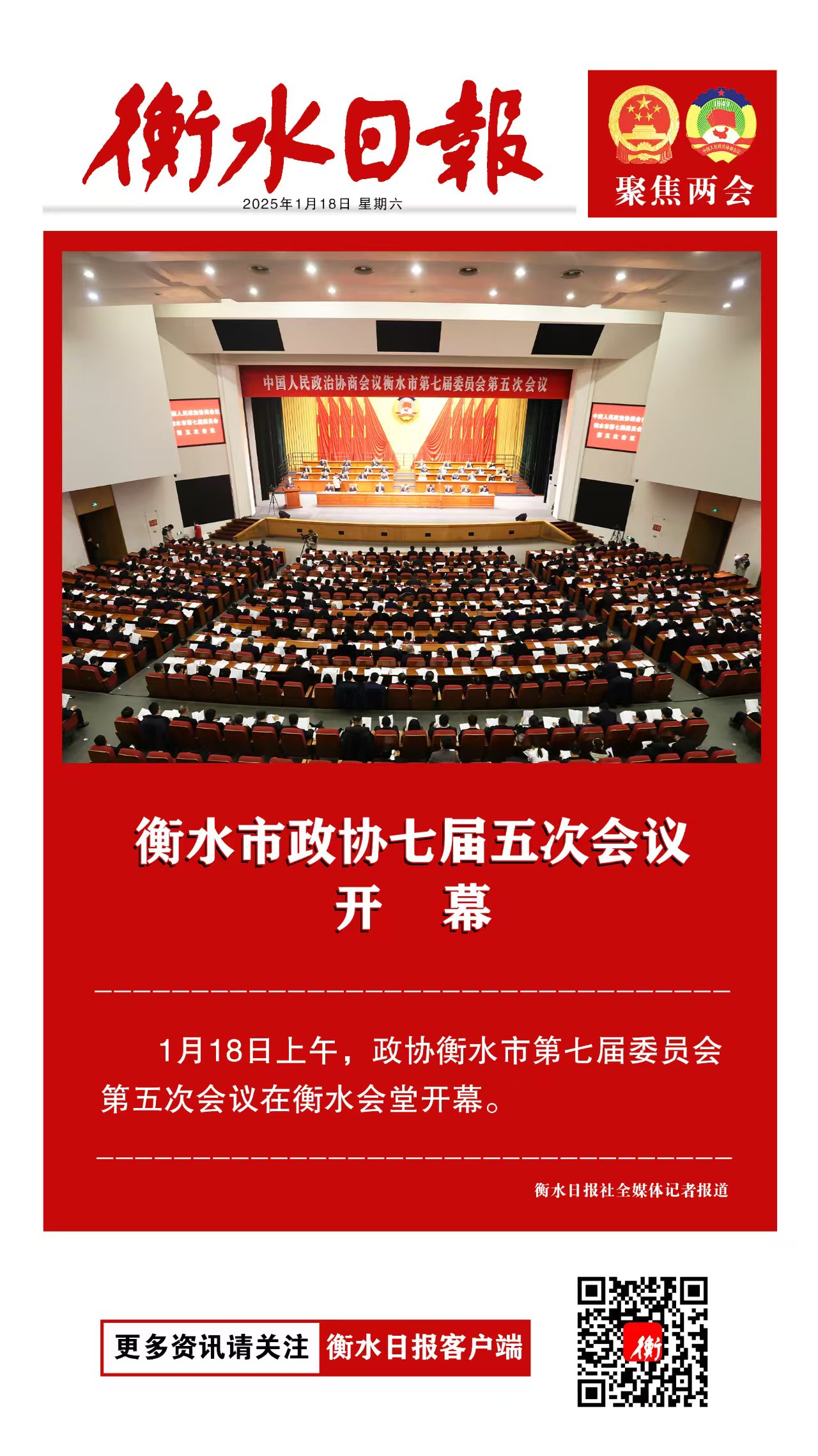 衡水日报社全媒体记者报道 点赞 +1 微博 微信 我要评论 发布 相关推荐 政府工作报告 ——2026年2月4日在衡水市第七届人民代表大会第七次会议上 政情 02-11 衡水市纪委五届六次全会召开 政情 02-07 中国共产党衡水市第五届纪律检查委员会第六次全体会议决议 政情 02-07 衡水市七届人大七次会议闭幕 政情 02-06 衡水市七届人大七次会议举行第二次全体会议 政情 02-06 衡水市政协七届六次会议闭幕 政情 02-05 董晓航参加衡水市政协七届六次会议市直一组讨论 政情 02-05 热门 一天 三天 一周 1 衡水市完成全省首个公共数据产品交易 公共数据收益缴入国库 2 “创赢未来”2026创业大赛衡水选拔赛开始报名了 3 仅用两分钟 衡水交警紧急开道护送断指伤者就医 4 孙敬学堂:深耕礼孝传承 筑强研学高地——我市文化建设走笔之三 5 【乡村行 看振兴】科技种出“新花样”——探访桃城区衡水国际设施园艺产业园 6 泰州科举院试文化文物展走进衡博 7 再攀高峰!中国人寿2025年总保费首破7000亿,同比增长8.7% 8 【凝心聚力 真抓实干 奋力实现“十五五”良好开局】锚定建设农业强国目标 提升农业综合生产能力 9 拾光纪·“我对这里充满感情”,习近平心系燕赵大地 10 保持战略定力和历史耐心 建设创新高地和发展样板 1 微改革激发新活力 微创新助力大发展——衡水市扎实推进改革创新工作走深走实 2 衡水市各部门各单位有力有序开展树立和践行正确政绩观学习教育 3 衡水市2026年上半年全国计算机等级考试本周末开考,市教育考试院发布考前温馨提示 4 衡水市完成全省首个公共数据产品交易 公共数据收益缴入国库 5 【新闻发布】 创新招商促落地 深化服务提质效 衡水市持续打造投资兴业热土 6 故城董学村:赓续千年文脉 绘就振兴新景 ——我市文化建设走笔之二 7 【湖城慢直播】踏春寻梅正当时 定格衡水春日里的亮丽风景 8 衡水发布27个重点招商产业 聚焦县域特色精准发力 9 衡水市建筑装饰协会2026年年会圆满召开! 10 春菜上新 衡水市区超市“鲜”意十足 1 “白牌”电动自行车还能骑吗? 衡水晚报“帮办”核实:已全面禁行,违规上路会受罚 2 高职单招考试3月21日开考 衡水9300余名考生将参加考试 3 【新闻发布】锚定便民利企目标 衡水发布2026年自然资源营商环境新蓝图 4 探秘气象“大本营” 解锁防灾新密码 饶阳县气象局举办世界气象日科普开放活动 5 315金融观察|大地财险罚单密集落地,暴露合规短板 6 以鱼养水净河道 2万余尾草鱼苗放流滏阳河衡水市区段 7 枣强县第四届杏花文化宣传推介会邀您共赴春日之约 8 2026年1-2月份主要经济数据公布 全省经济起步有力 9 沃土育新苗 科创结硕果——探访河北威昌佳泰实业有限公司 10 河北省2026年“世界水日”“中国水周”现场宣传活动在衡水举行 广告 广告 广告 24小时 1 家门口大变样 阜城县大龙湾村旧貌换新颜 2 衡水桃城区人社局:“三措并举”扎实推进社保卡惠民服务 3 把健康饮水“秘诀”送到百姓身边 景县疾控中心开展“世界水日”“中国水周”宣传活动 4 衡水向城市“顽疾”亮剑:文明养犬入人心 车辆停放更有序 5 武邑县网络达人助力传统非遗“出圈”焕新生 6 【新闻发布】以改革破题 以数智赋能 以服务暖心 衡水市数政局按下优化营商环境“快进键” 7 未来一周 衡水市花粉浓度进入高峰期 8 保持战略定力和历史耐心 建设创新高地和发展样板 9 习近平总书记引领雄安新区高质量建设和发展的故事 10 白祥友名校长工作室 | 激潜教育探索随笔(第787期)