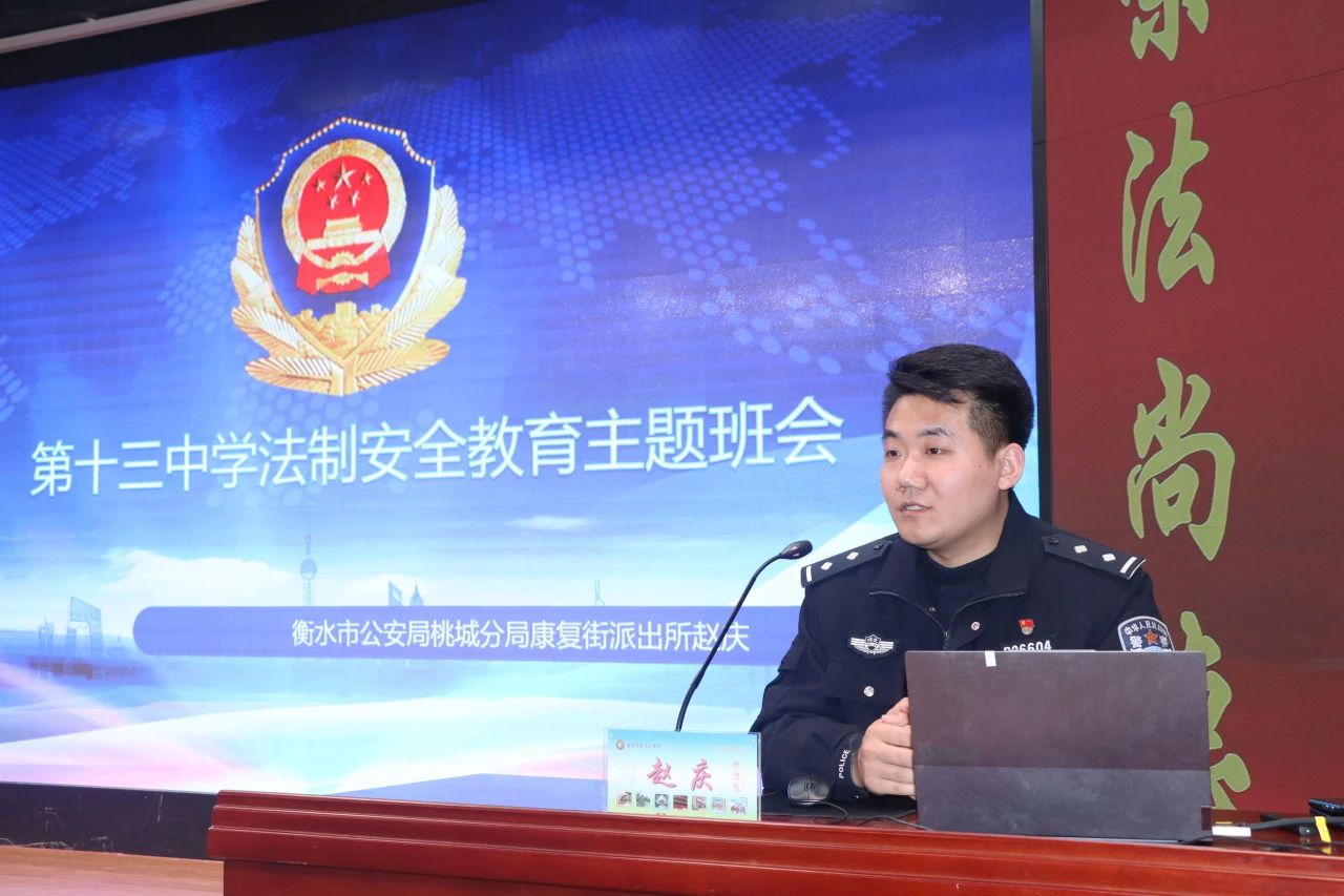 为进一步增强未成年人法律意识,保护未成年人健康成长,提高学生的思想道德水平和法律素养,近日,衡水十三中组织开展了“法治之光耀校园 德法兼修育新人”主题宣传教育活动。本次活动特邀衡水市康复街派出所具有丰富经验的民警赵庆担任主讲老师,他为同学们普及了一系列实用的法律知识,让法治走进校园,助力同学们了解法律知识、筑牢法治意识。