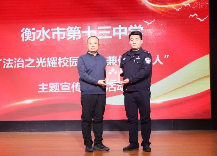 衡水十三中党委委员、纪委书记刘学通为赵庆警官颁发了“衡水市第十三中学法治指导教师”聘书。