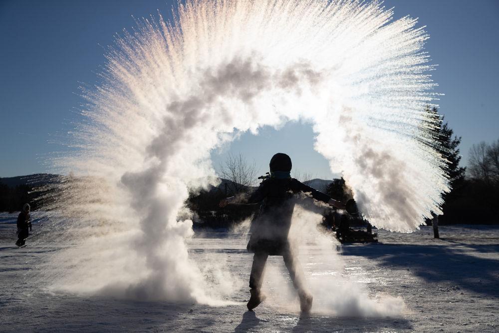△游客在黑龙江漠河市北极村体验“泼水成冰”。