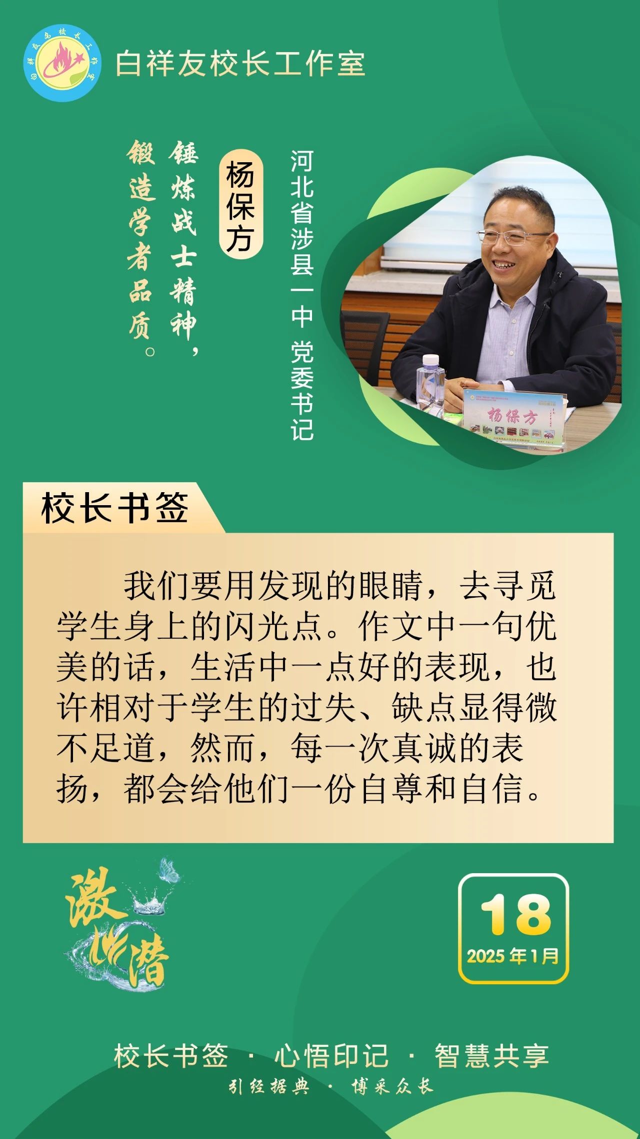 “白祥友校长工作室”成立于2019年4月,是教育部“国培计划”中小学名校长领航工程、河北省首批名校长工作室,目前省内外成员校56个。工作室坚持“资源共享、智慧共融、互助共赢”理念,已成为思想碰撞的交流场,资源共享的品牌站,成果展示的辐射源。