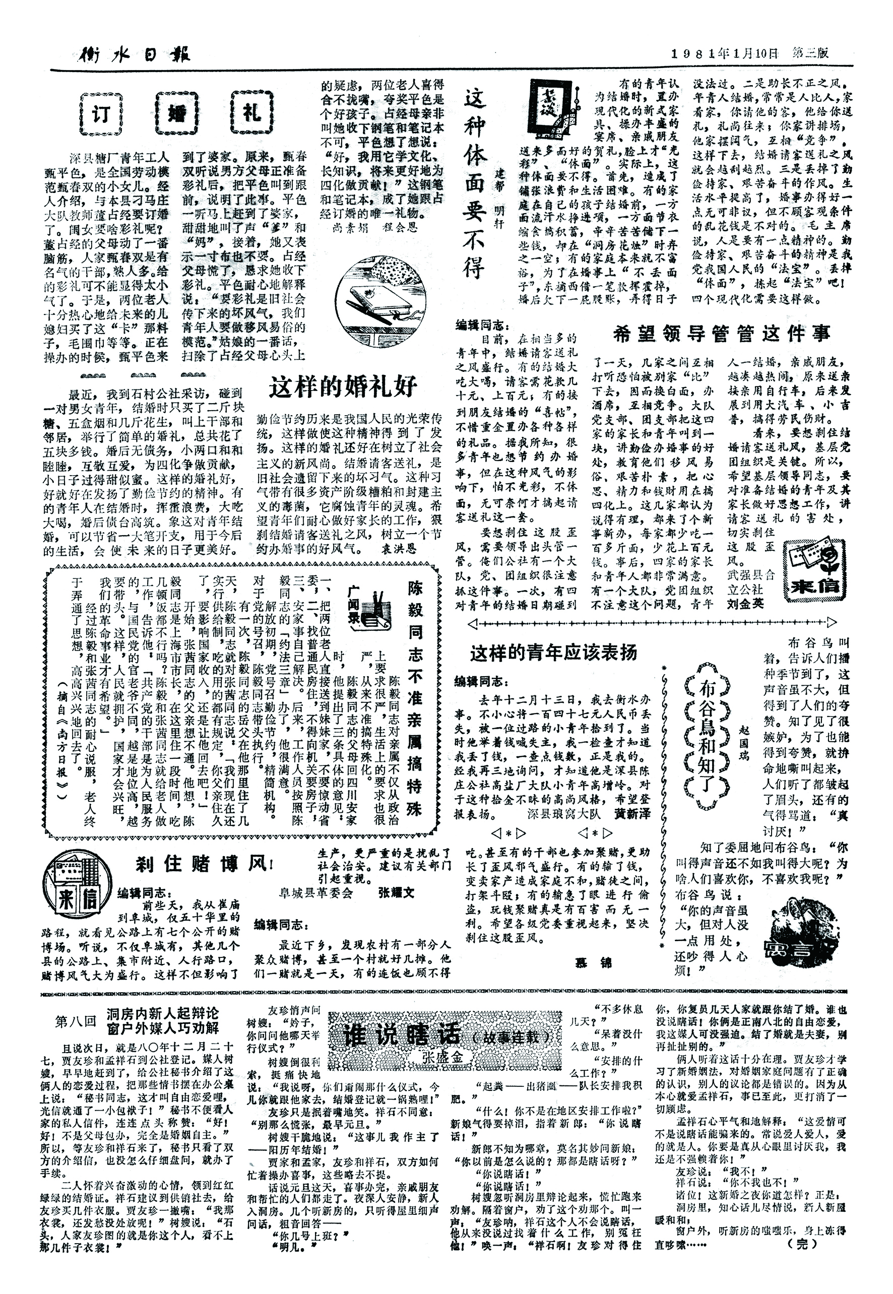 1994年2月23日1版:武邑县赵桥乡夹河村两青年农民在蔬菜大棚前举行婚礼,新娘父母给女儿建“大棚”作嫁妆,送给年轻人一条致富路;1998年12月14日1版:桃城区河沿镇白空村一户农家,举办了一场吟诗对对儿的文化婚礼,贺喜的人们争相为新郎、新娘献上祝福的诗句……